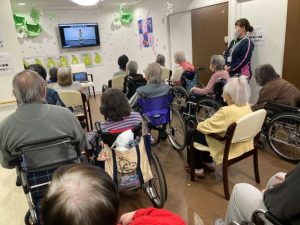 TVに映し出さられ、まるで目の前に先生が居るのと同じ状況でレクリエーションが行われます。
