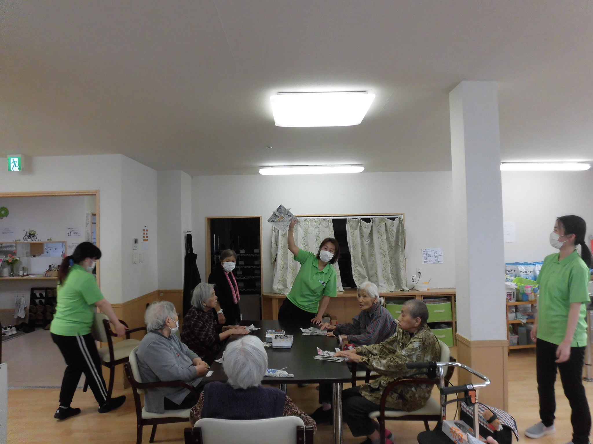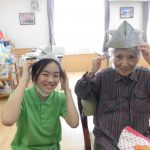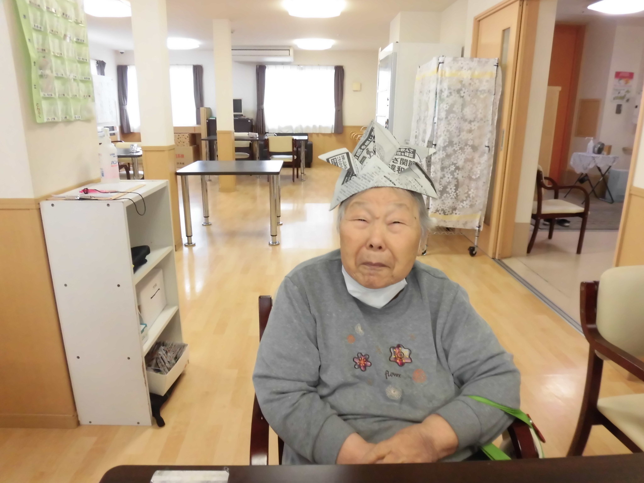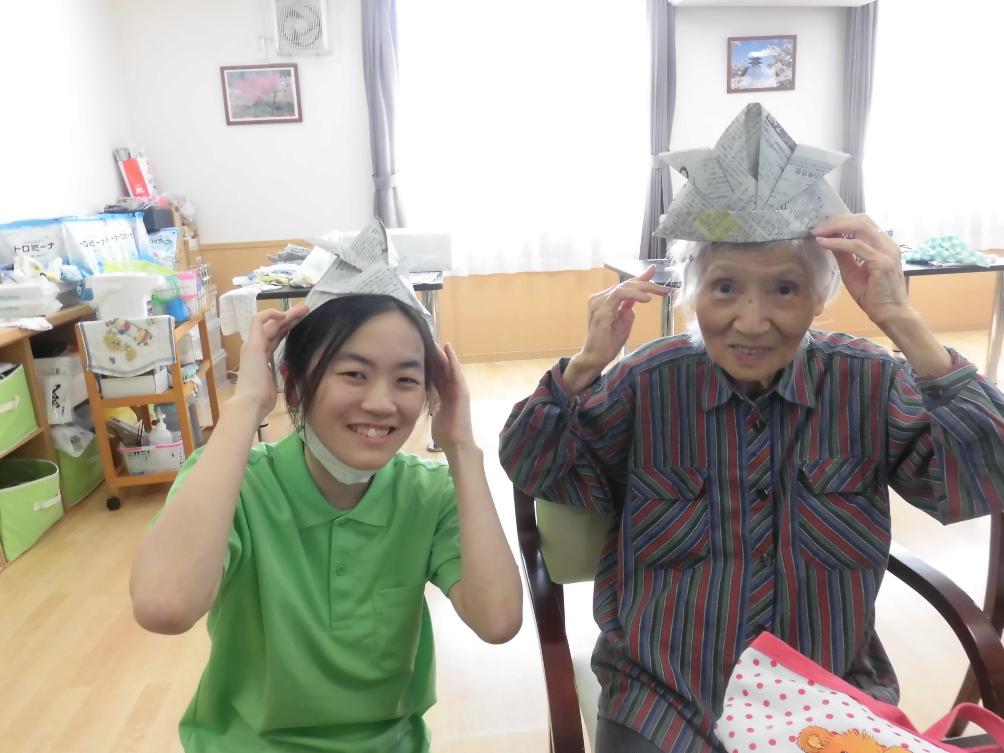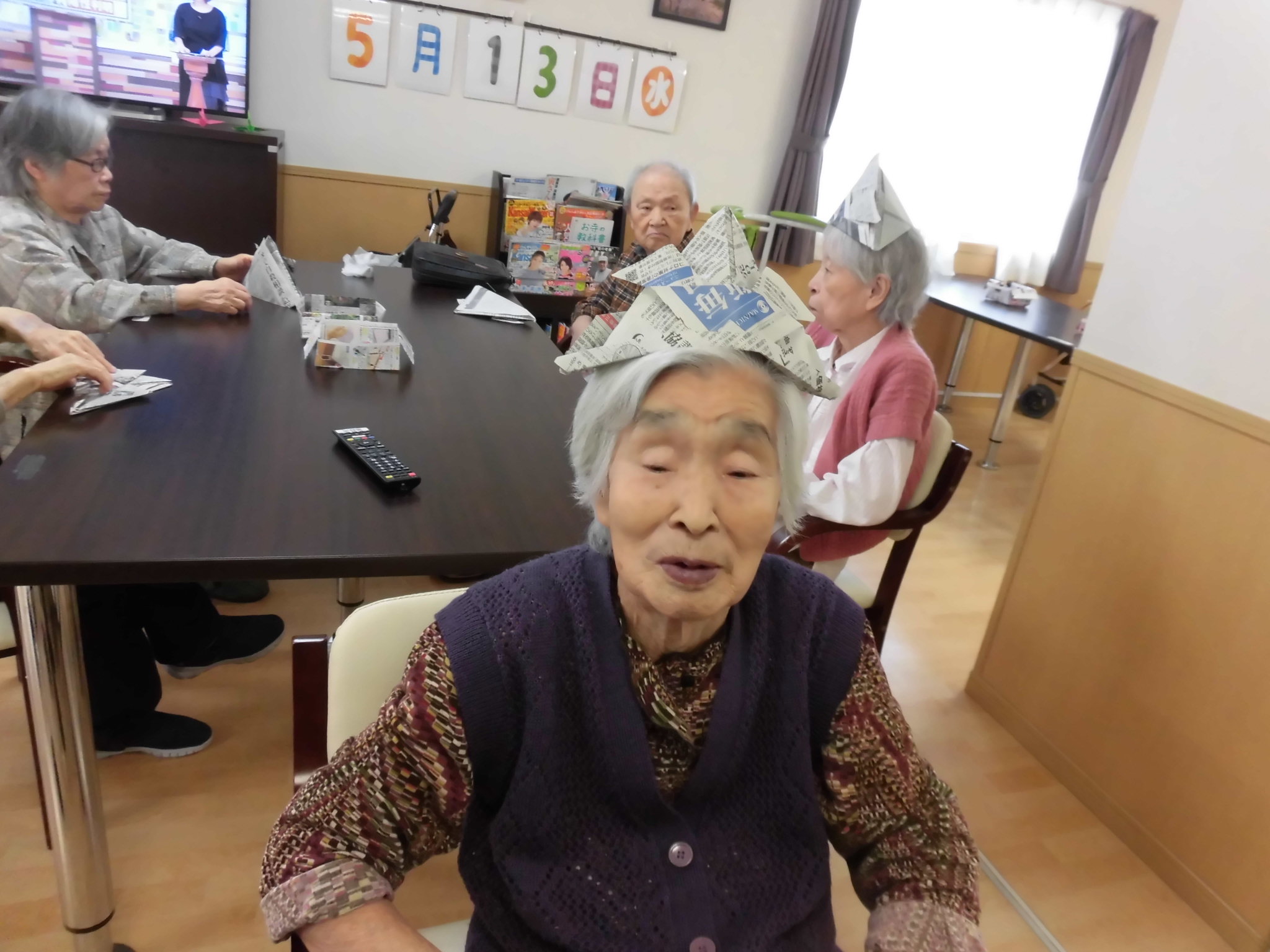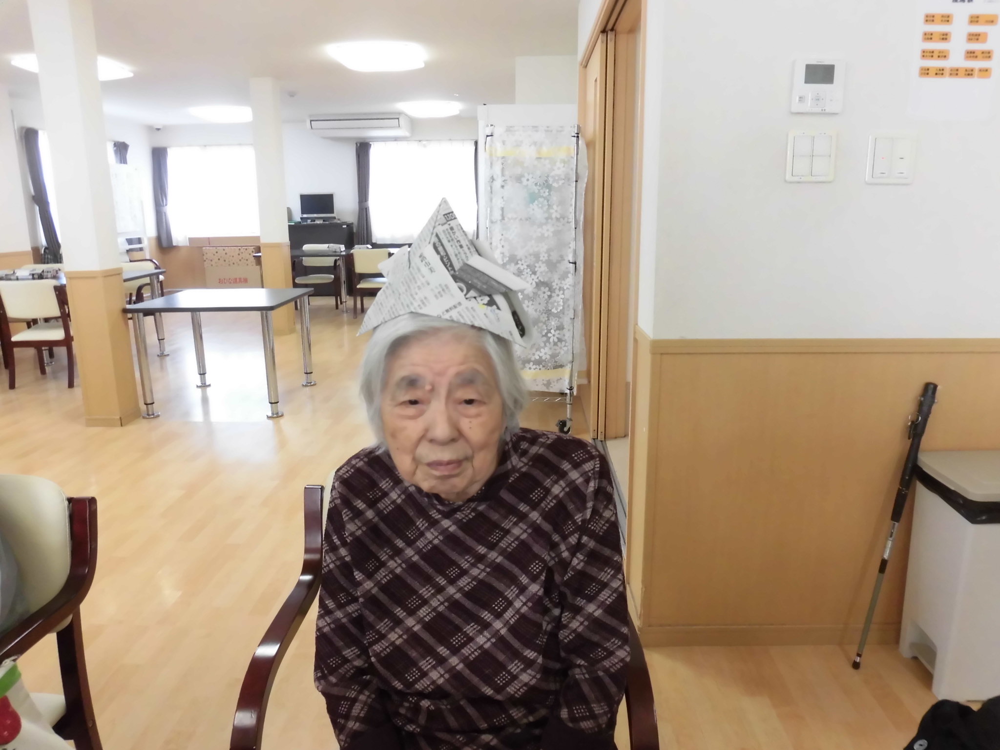 入居者の皆さま方に新聞紙で作った兜を被り「茶摘み」の歌に合わせて手遊びを行う という