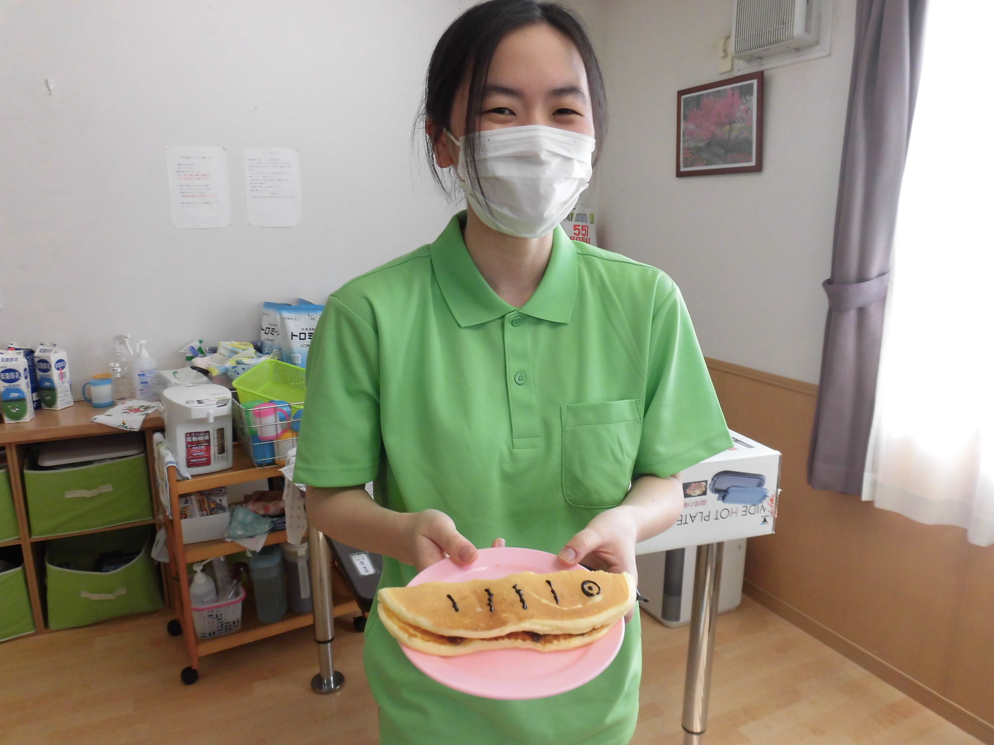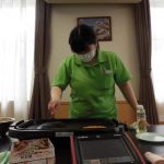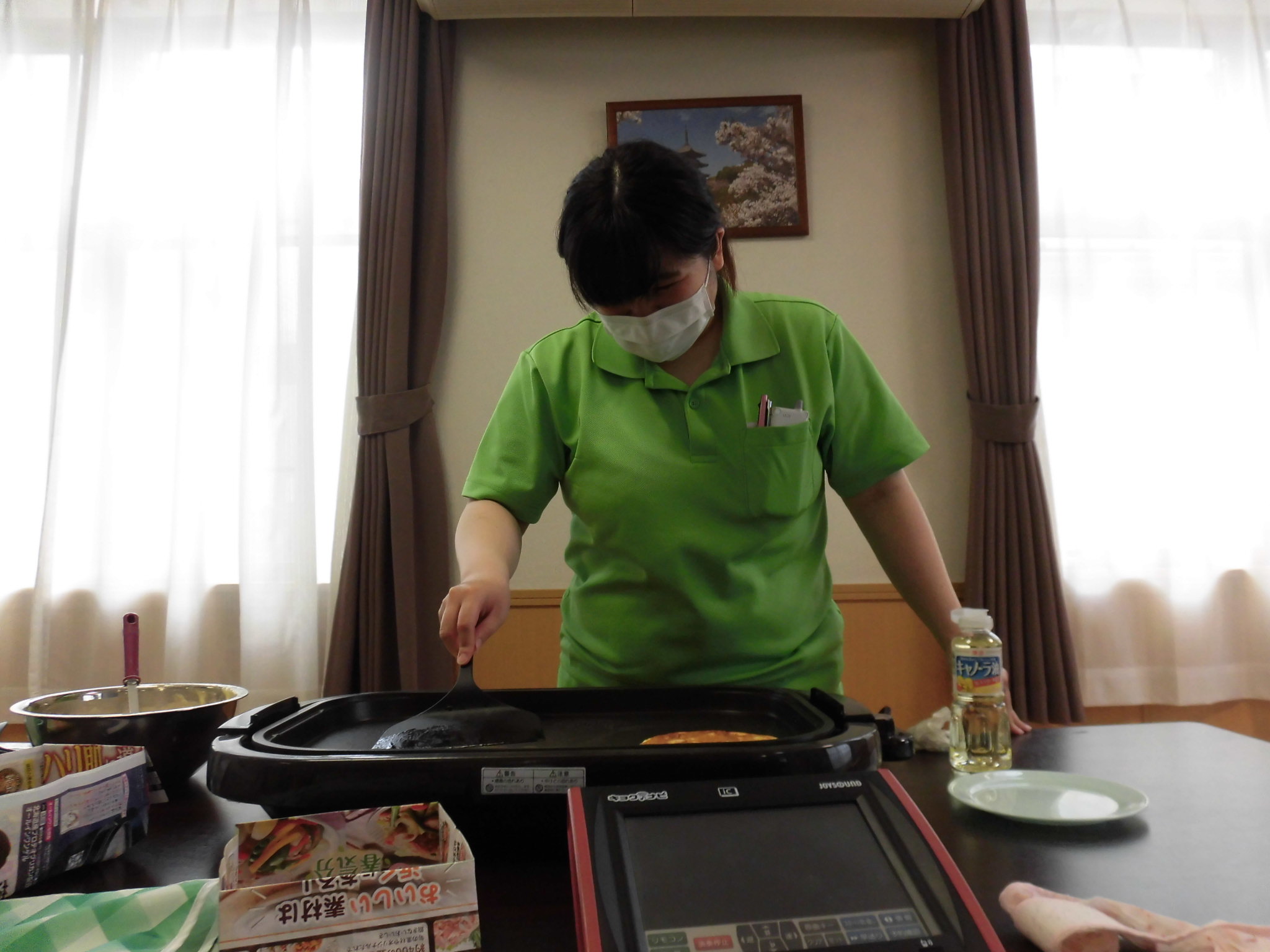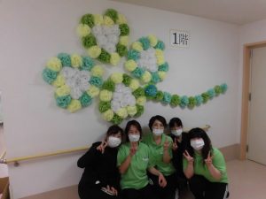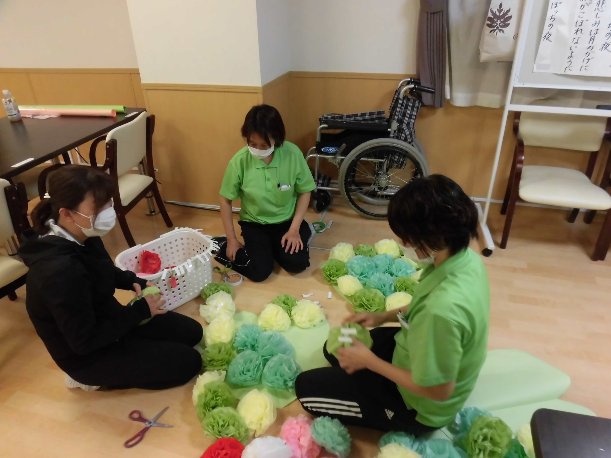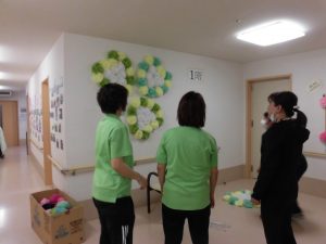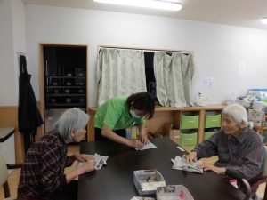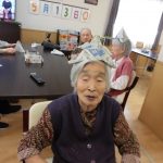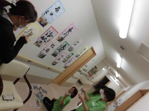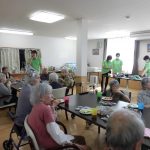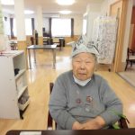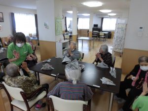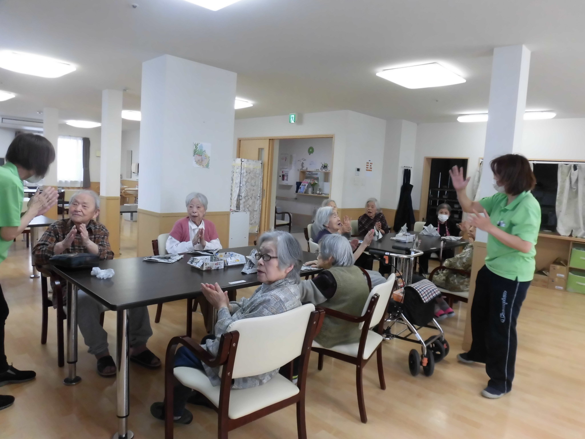 入居者の皆さま方に新聞紙で作った兜を被り「茶摘み」の歌に合わせて手遊びを行う という