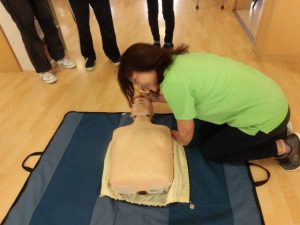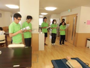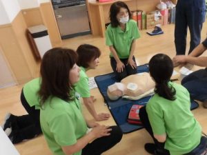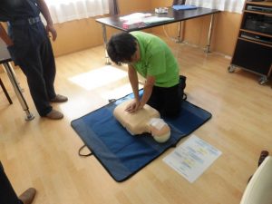 消防署の方にお越しいただき救急手当の講習会及びAEDの使用方法についてレクチャーいただきました。