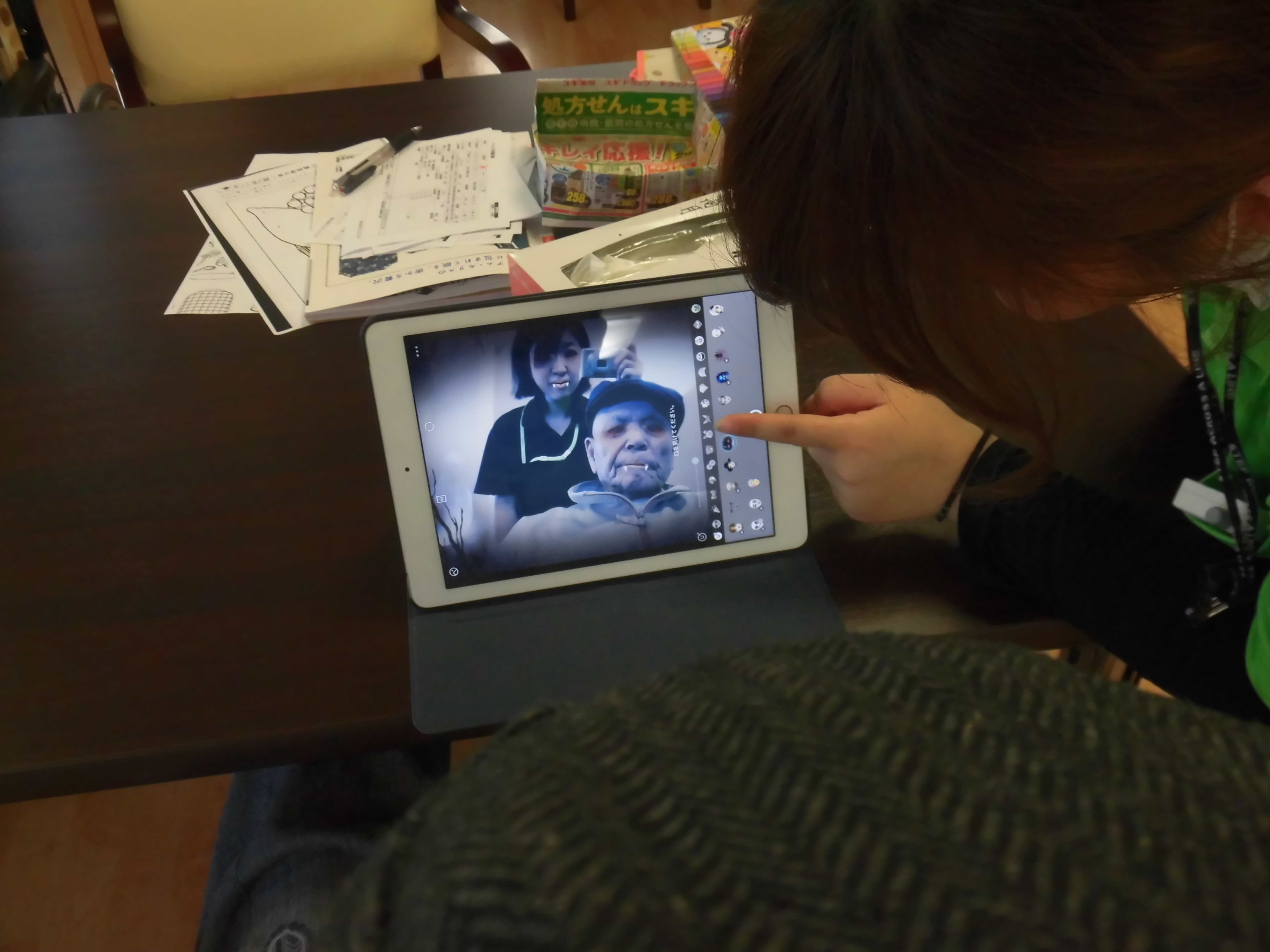 O職員のタブレットを使い、写真加工アプリで楽しんでおられました。