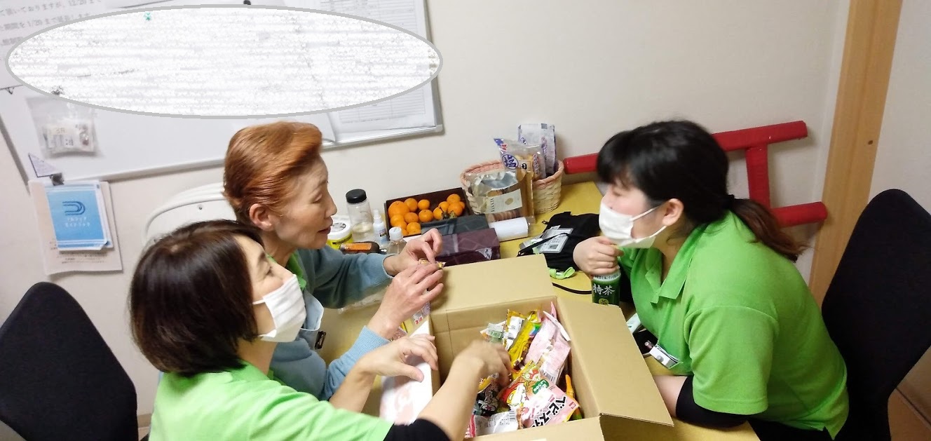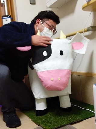 ※年内最後のお夕食時、来年の干支である、めちゃめちゃかわいい牛さんの張りぼてが届きました。