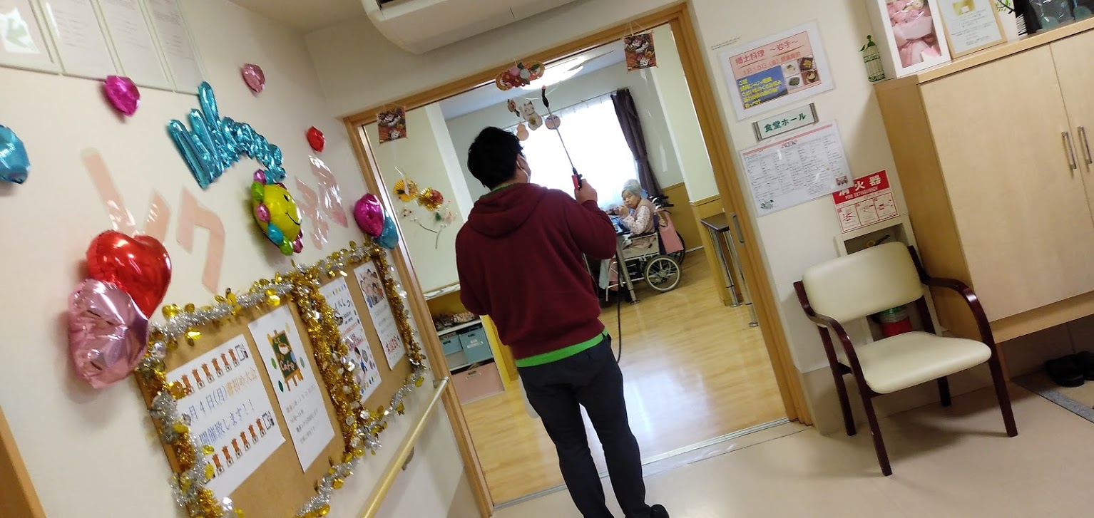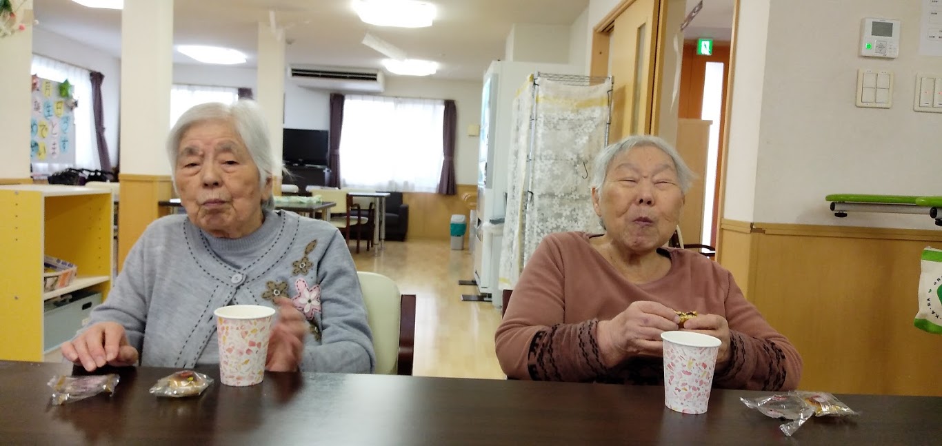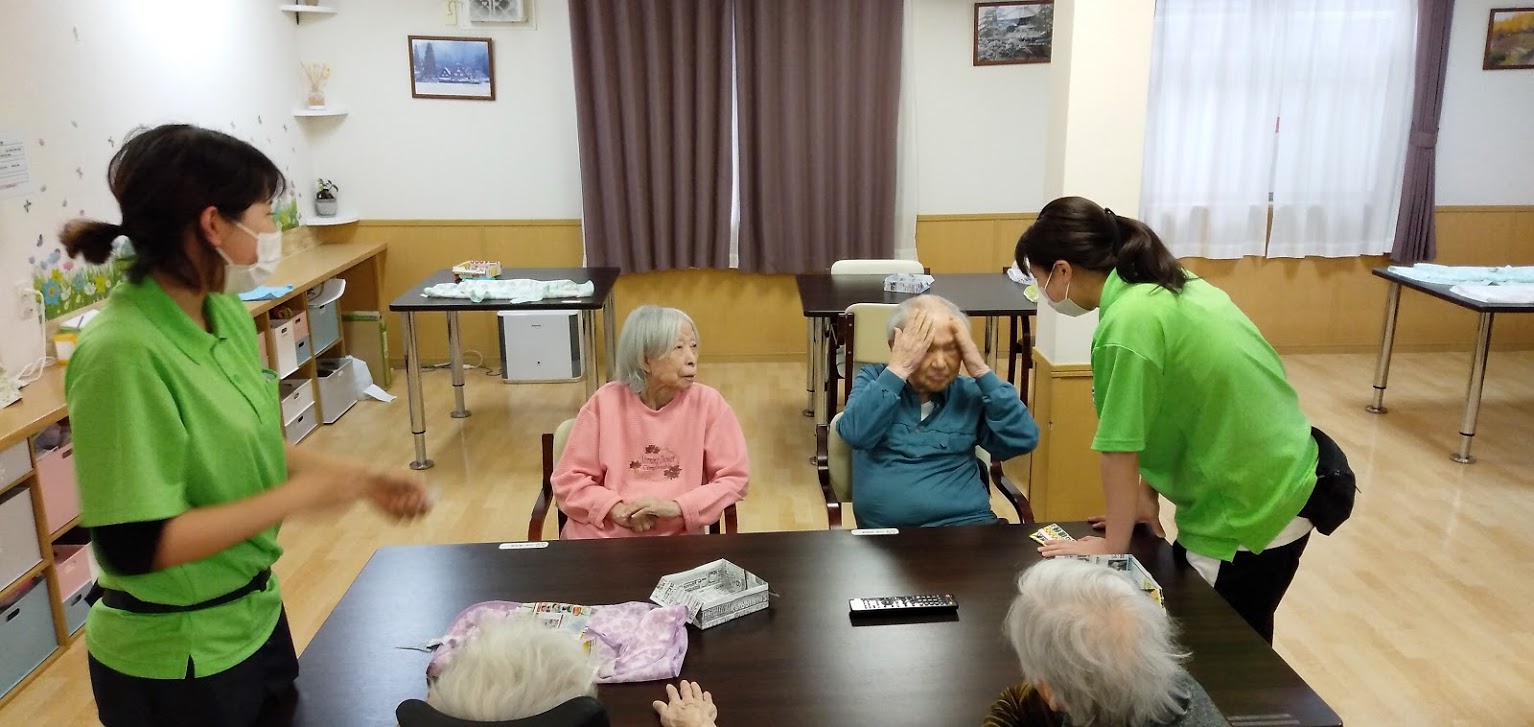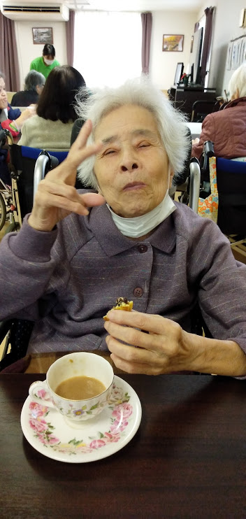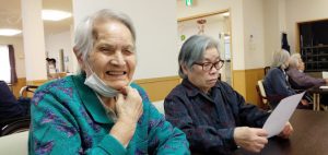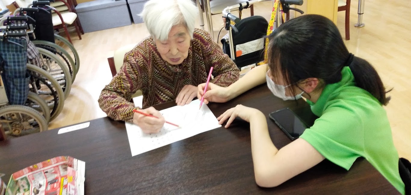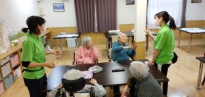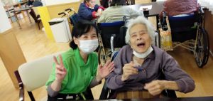 昼下がり、食堂でのご利用者様とケアワーカーとの一幕。