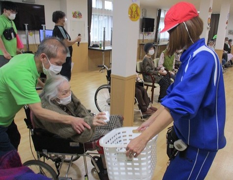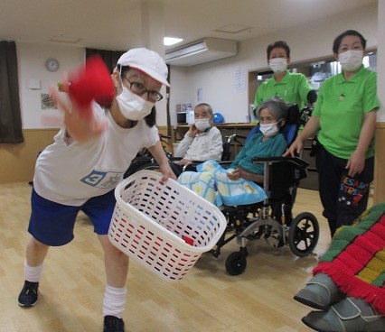 コロナ禍でまだまだ外出が出来ない中、食堂での運動会ですが、玉入れやボール渡し・職員による