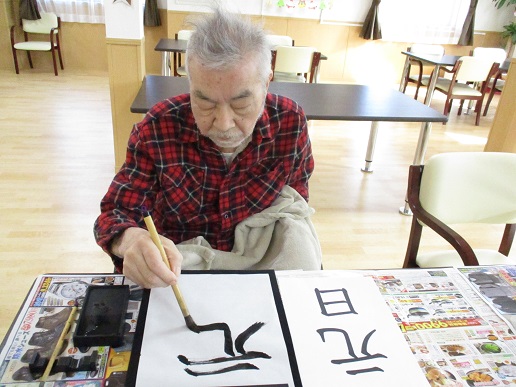 書き初めには少し早いですが、今年最後のお習字レクは新年に因んだ言葉を書いていた