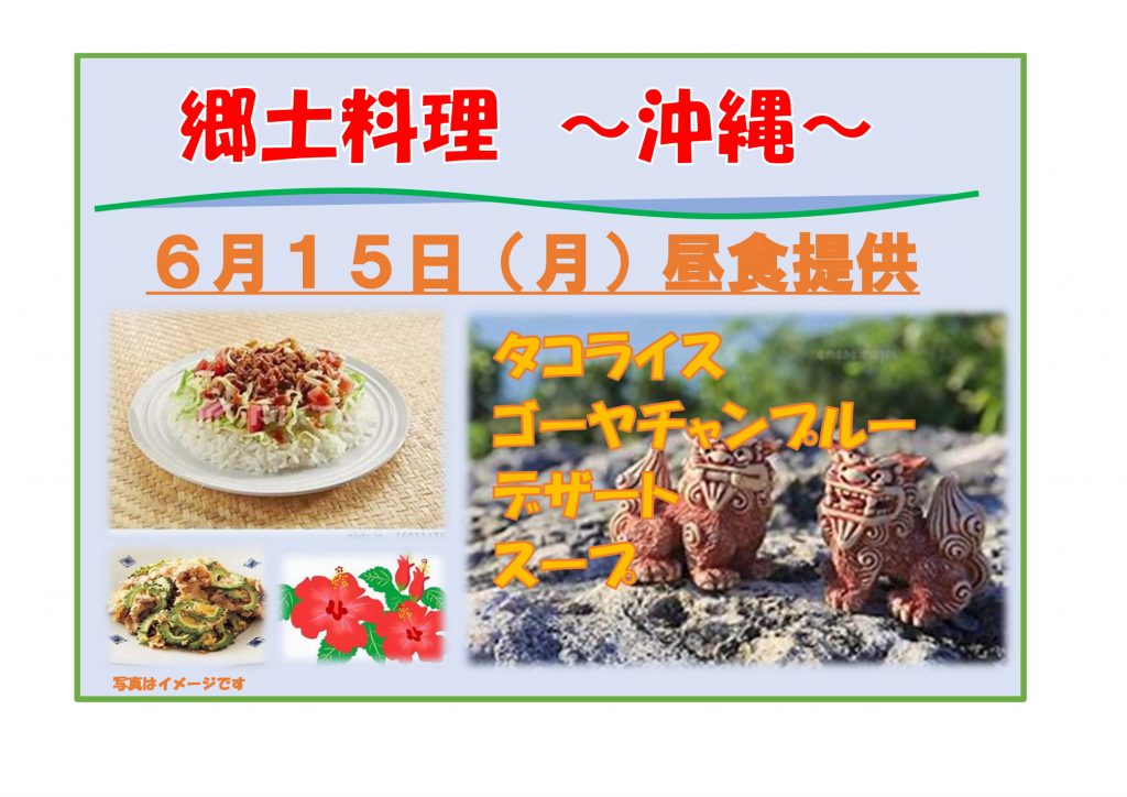 今月の郷土料理は「沖縄県」です。これから段々と暑くなってきますので、沖縄料理を食べて暑さを吹き飛ばしましょう~!(^^)!