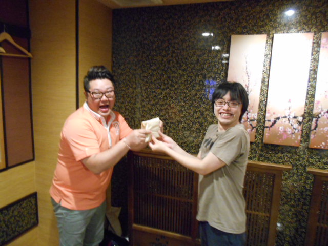 写真が少しブレていますが右側のN職員に最近お子様が生まれましたので、職員有志を代表してOマネージャー