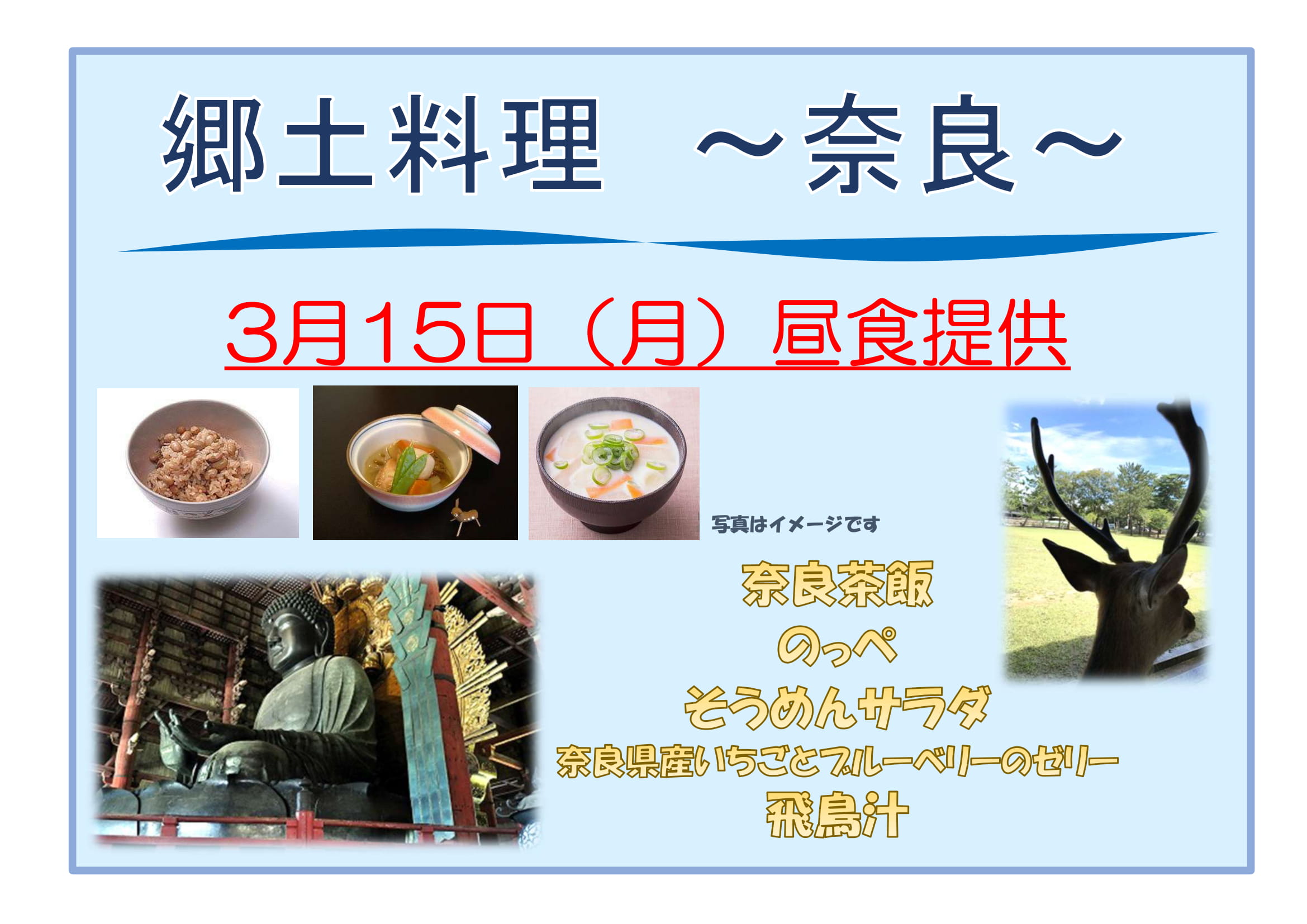 奈良県は大阪と近いですが、聞き慣れないメニューが多いですね!3/15をお楽しみに~(^O^)/