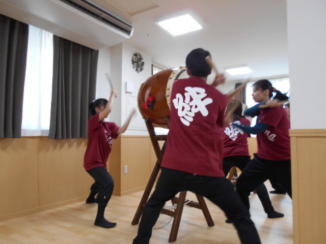 昨日、職員のMリーダーが所属している和太鼓チームが演奏に来てくださいました♪