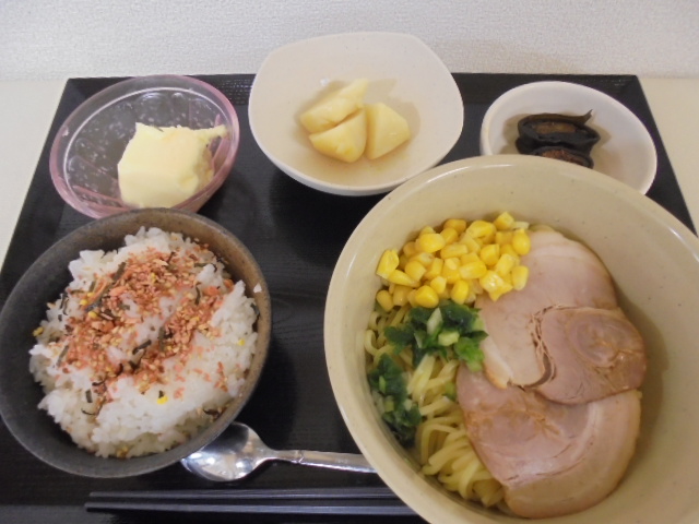 味噌ラーメンにじゃがバター、昆布巻きとデザートはチーズケーキでした!!味噌ラーメンのチャーシュー