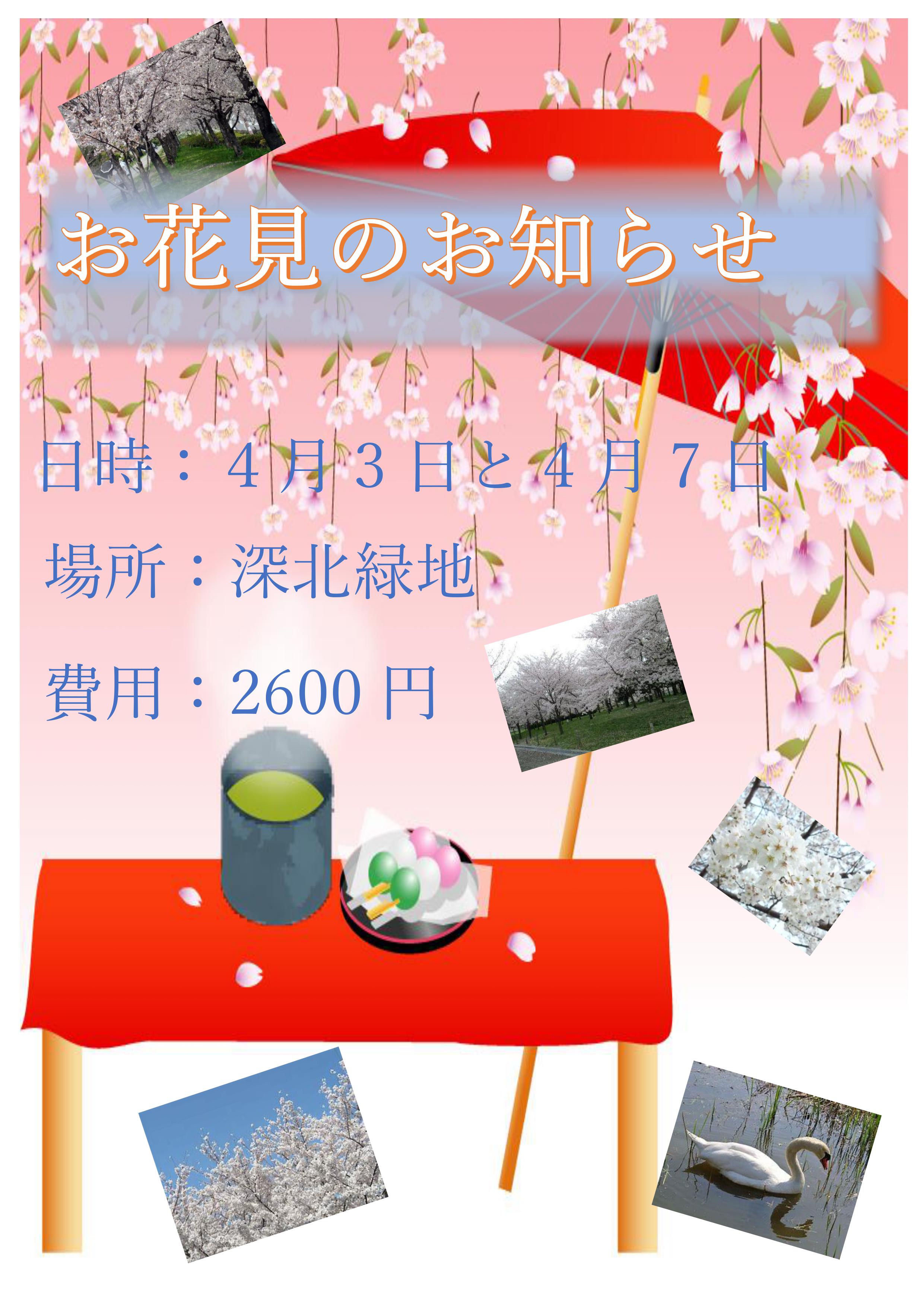来月の3日と7日にお花見見学へ参ります。場所は深北緑地で~す!!