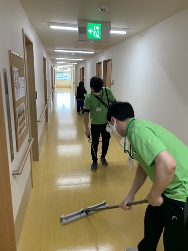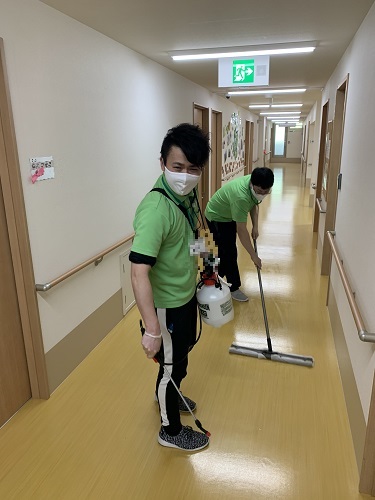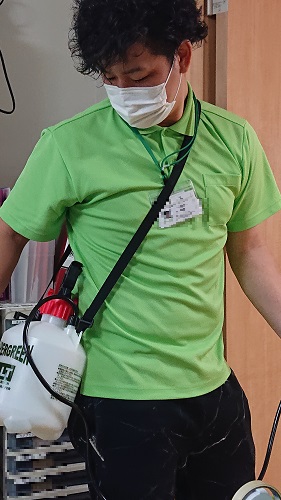 ウィルス対策として、消毒噴霧器で吹きかけ、