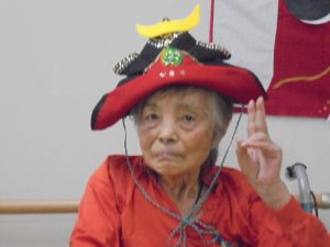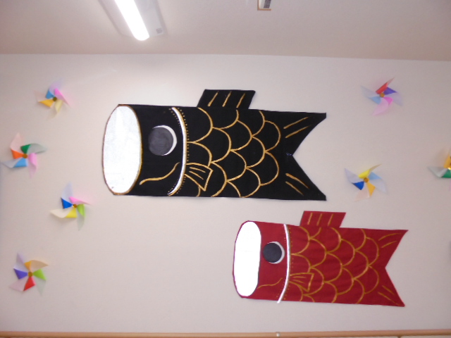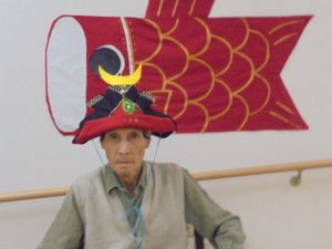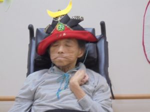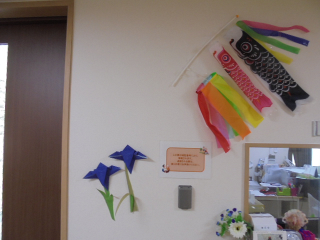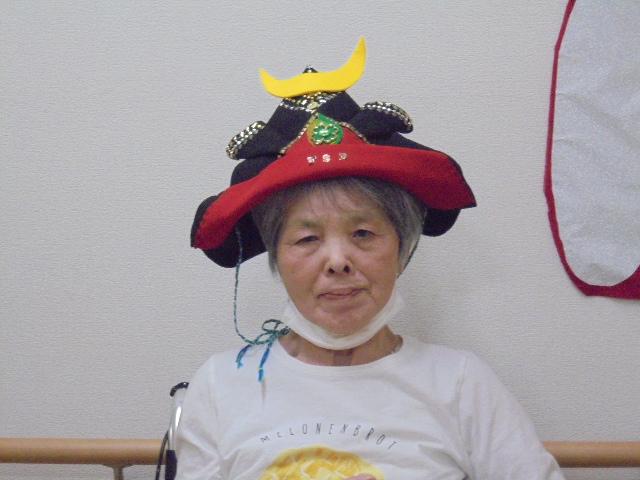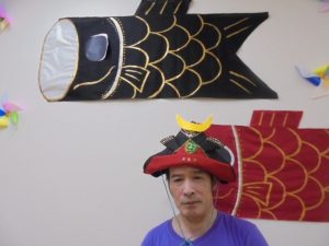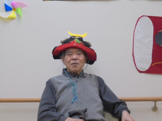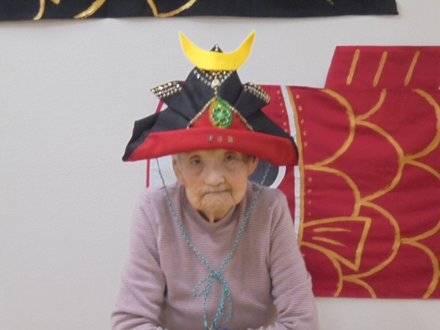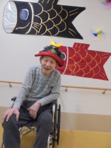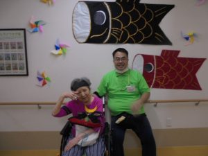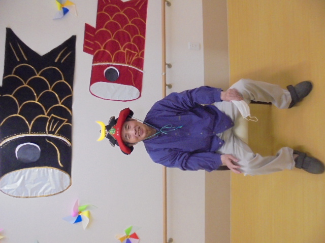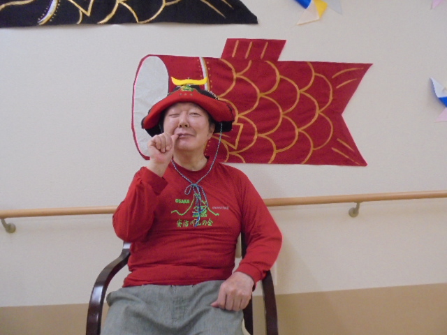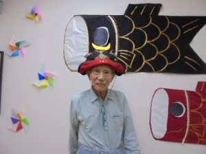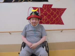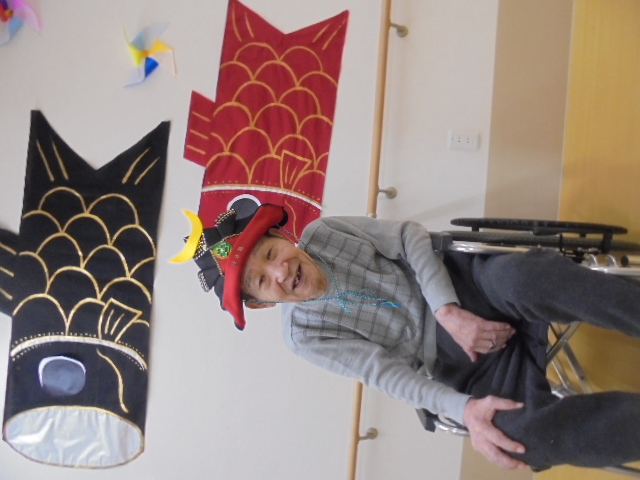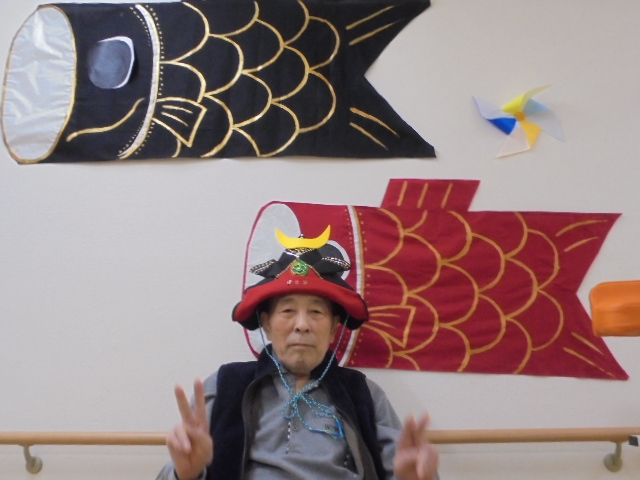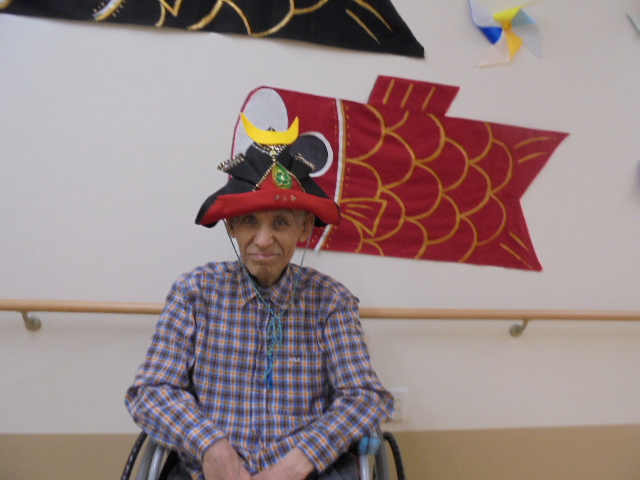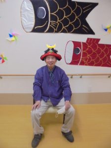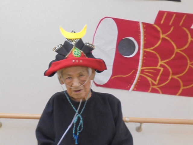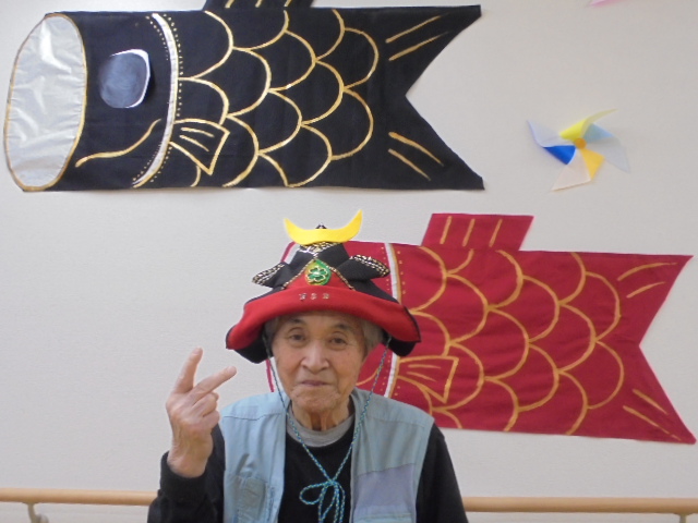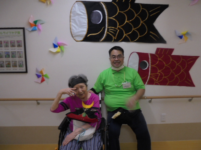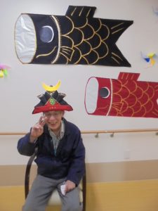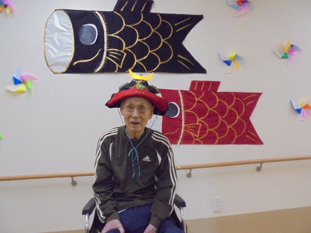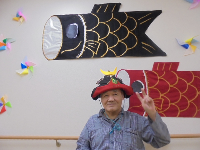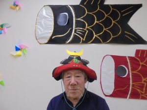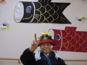 端午の節句に合わせた鯉のぼりやかぶとが入居者様からとても人気で、連日記念撮影が行われています。