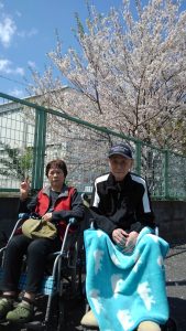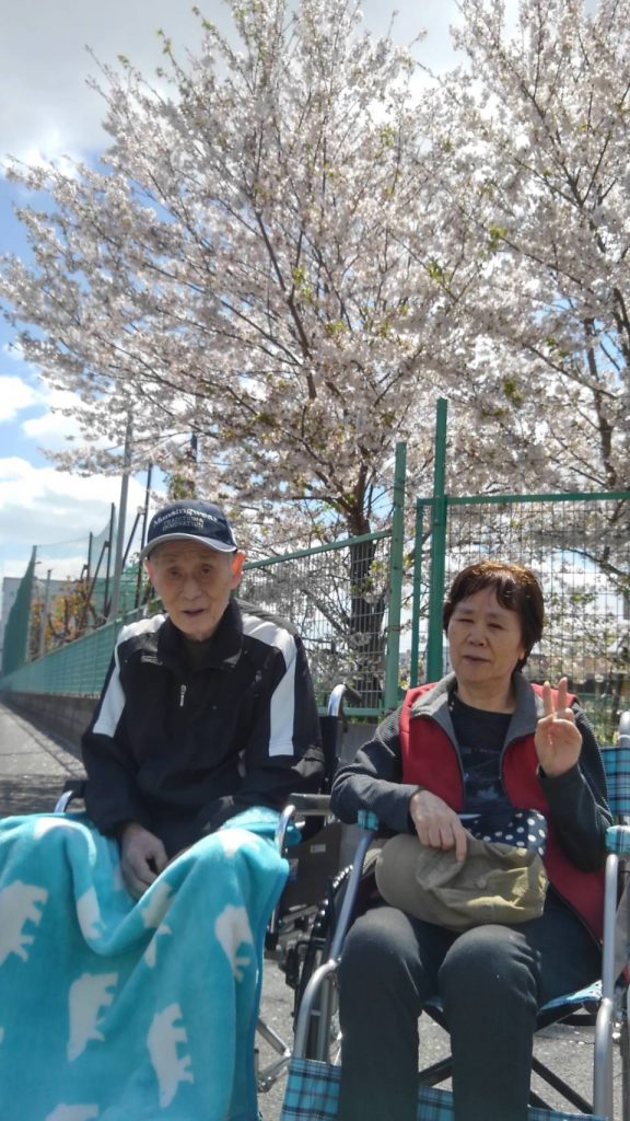 日が照ると暑いくらいの陽気のなか、いつもは車いすのお父さんも杖をついてゆっくり歩行!