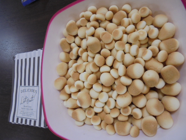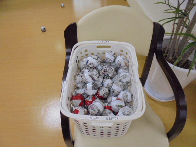 本当の豆を投げたら痛いので新聞紙を代用しました!食べる方は豆に見立てて卵ボーロの掴み取り~!!