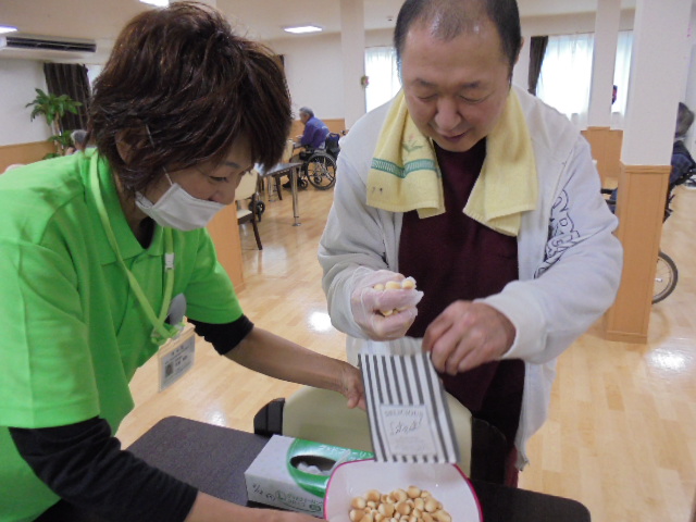 T事務員!はしゃぎ過ぎです~。鬼役のKヘルパーに恨みでもあるんでしょうか…?(そんなことは決して無いそうです)
