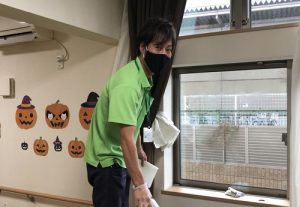 Tケアワーカー、一生懸命掃除をしております!雑巾二刀流です☆(笑)