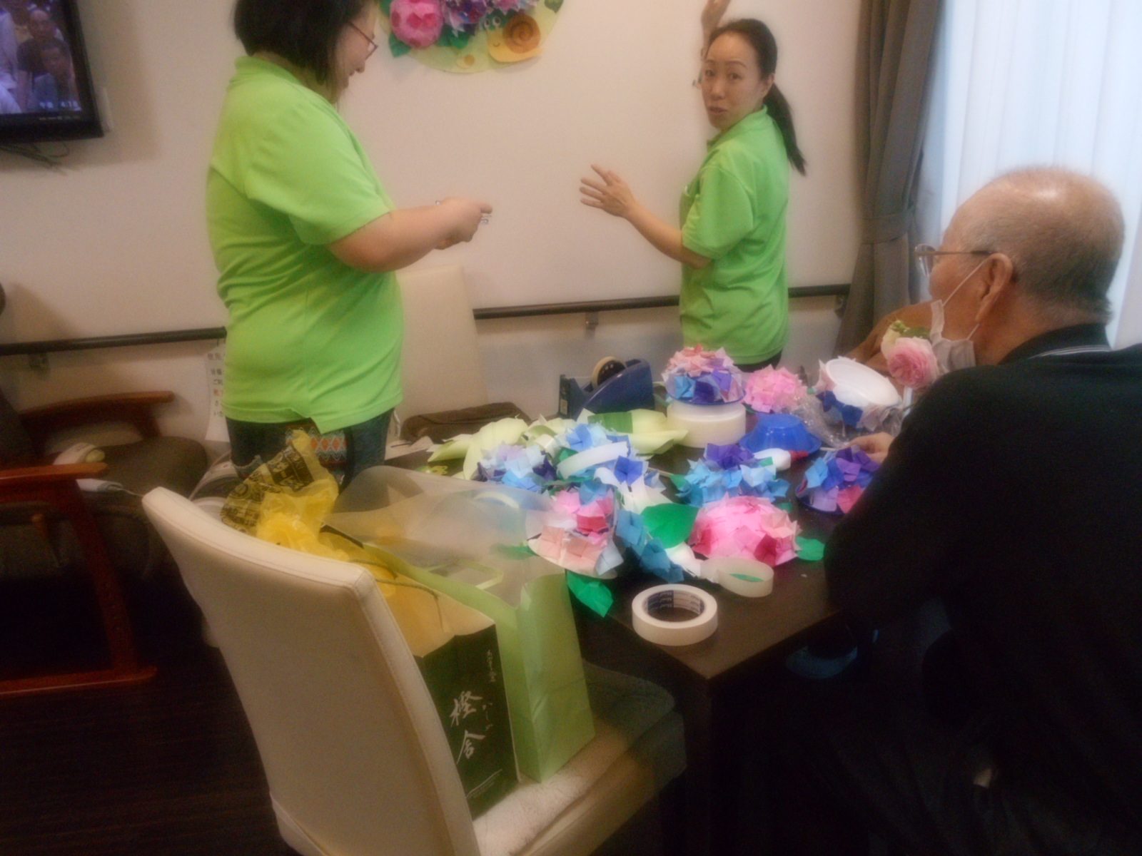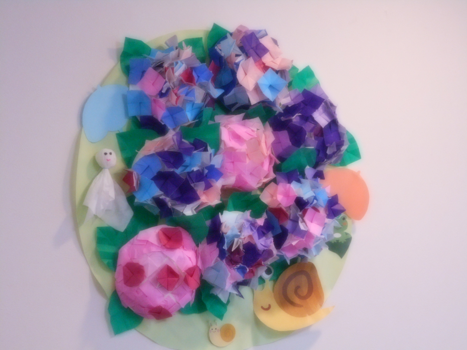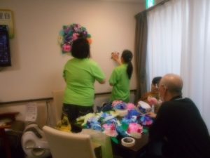 みなさんに作っていただいたあじさいを飾り付けしています☆