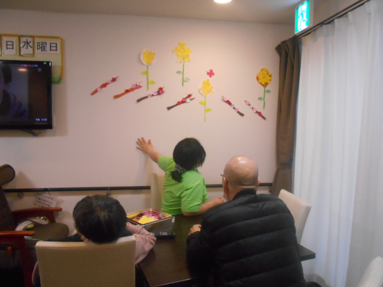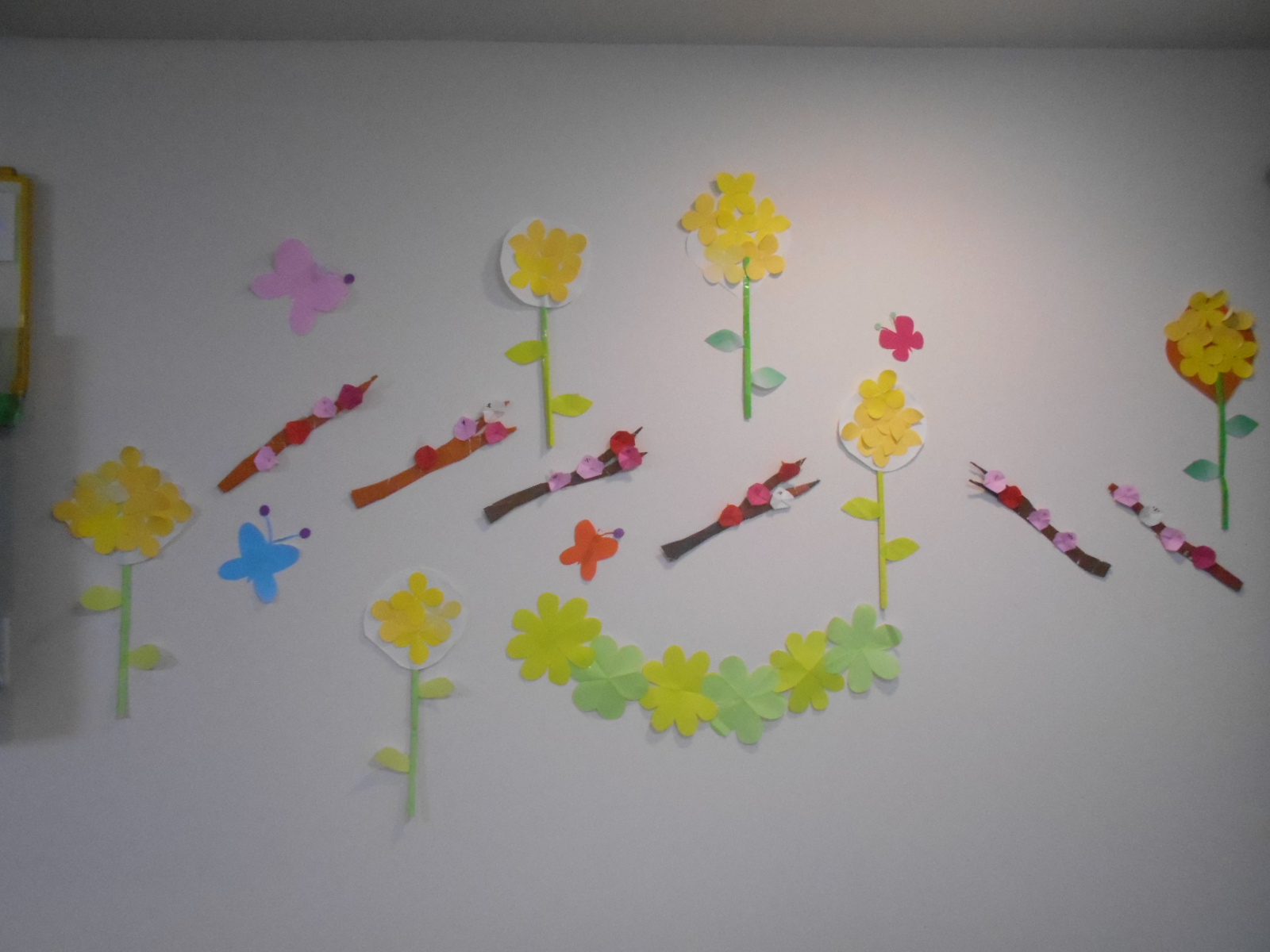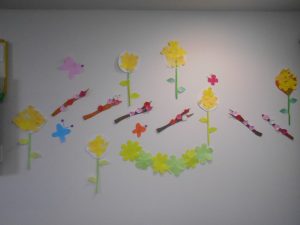1Fフロアに紙で作った、梅とたんぽぽの飾り付けを行いました(^^♪