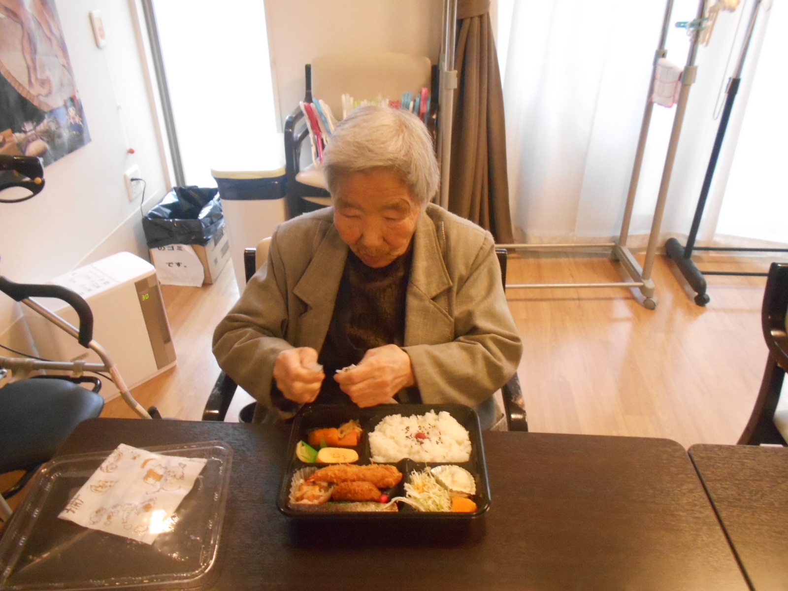 先日、3Fにてお弁当レクを行いました。お隣にあるお弁当屋さんの和風弁当です♪