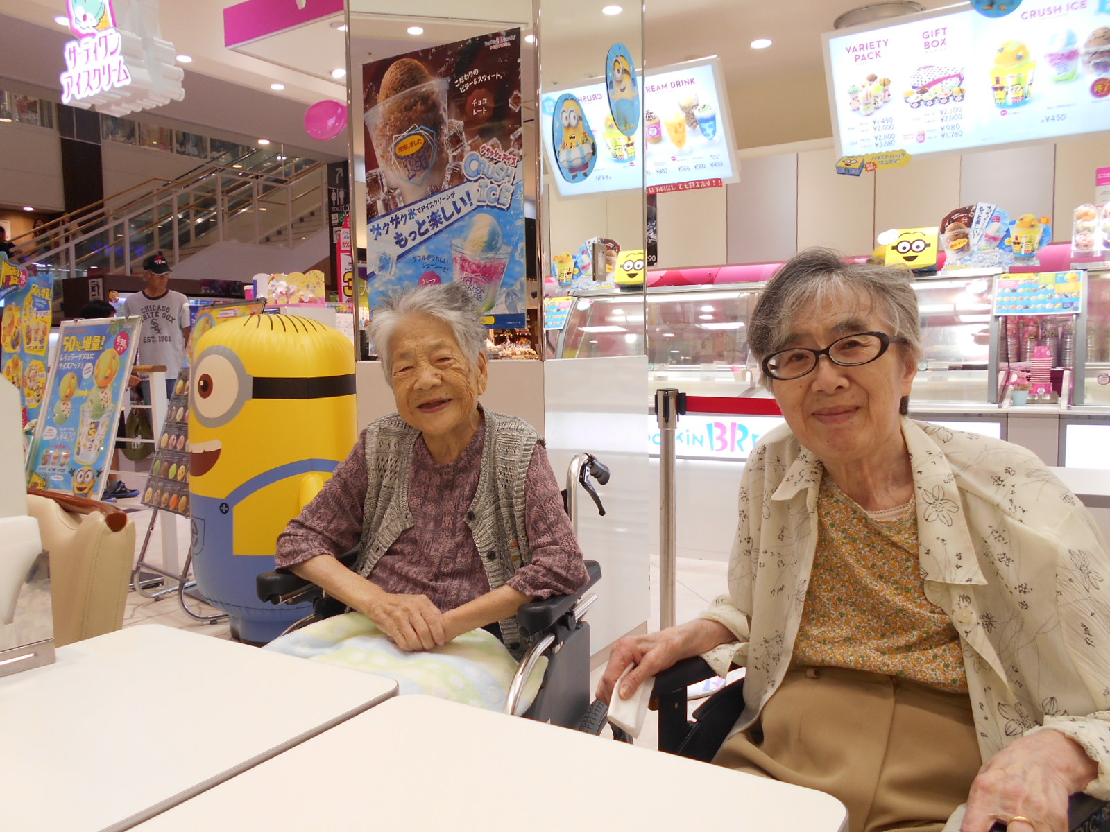 今回で3回目となる「アイスクリームツアー!」今回もアピタ西大和にある「サーティワンアイスクリーム」に行ってきました。先日ご入居されましたU様とF様です。お二人ともいい笑顔です。U様は抹茶 F様はチョコレートを召し上がられました(^_-)-☆ 「次はなにをたべようかなあ??」とF様。「つめたくておいしい!」とU様。