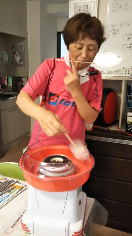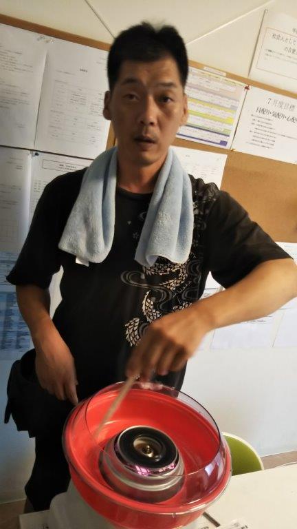夏祭りの準備をしています。綿あめをお出しする予定です。初めてなのでまずは職員で試しています。