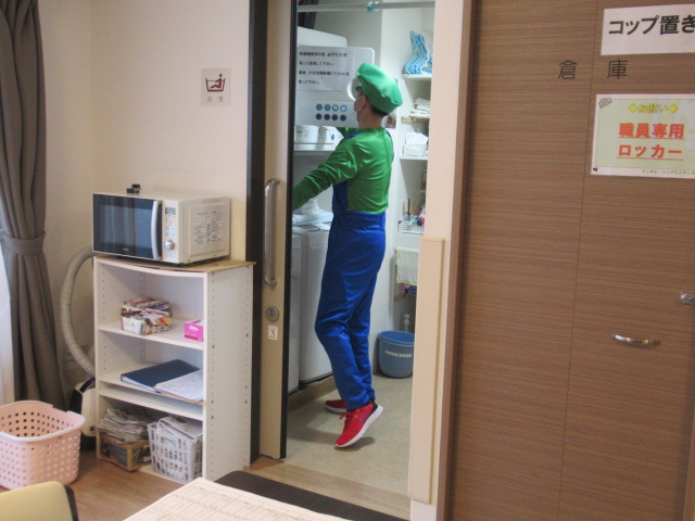 ハロウィンイベントの際、ルイージの仮装をして仕事をするMリーダーです♬