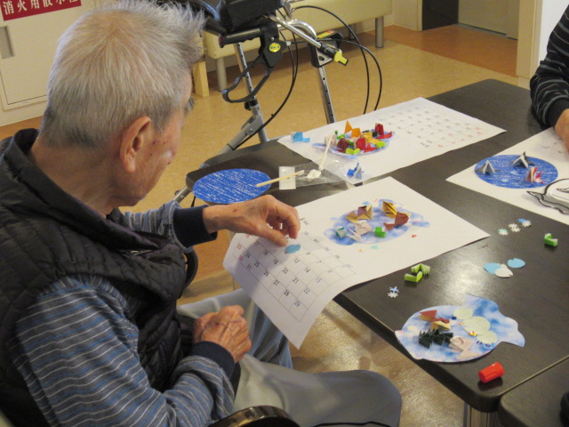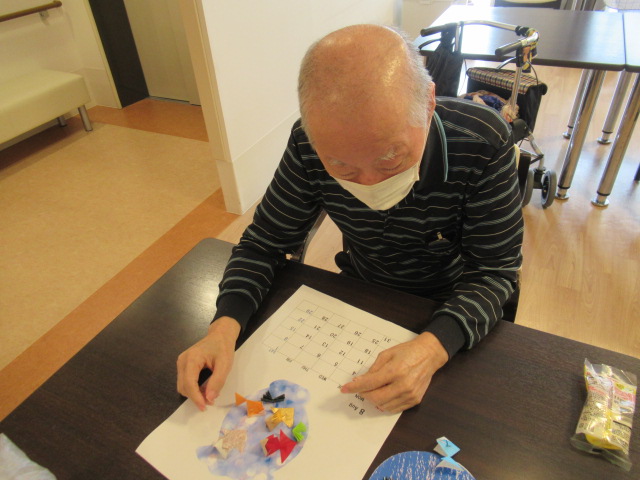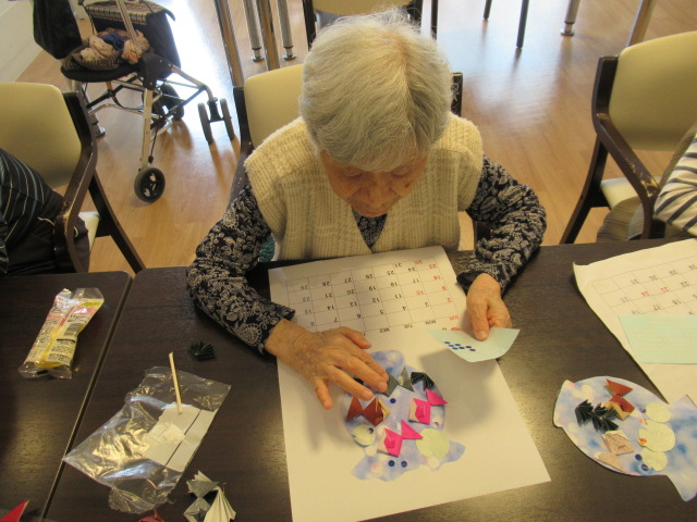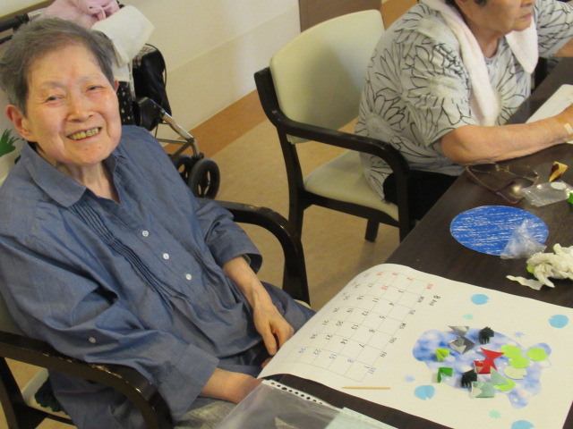 入居者様に好きな色の折り紙や画用紙を貼っていただき、思い思いのカレンダーができました☆