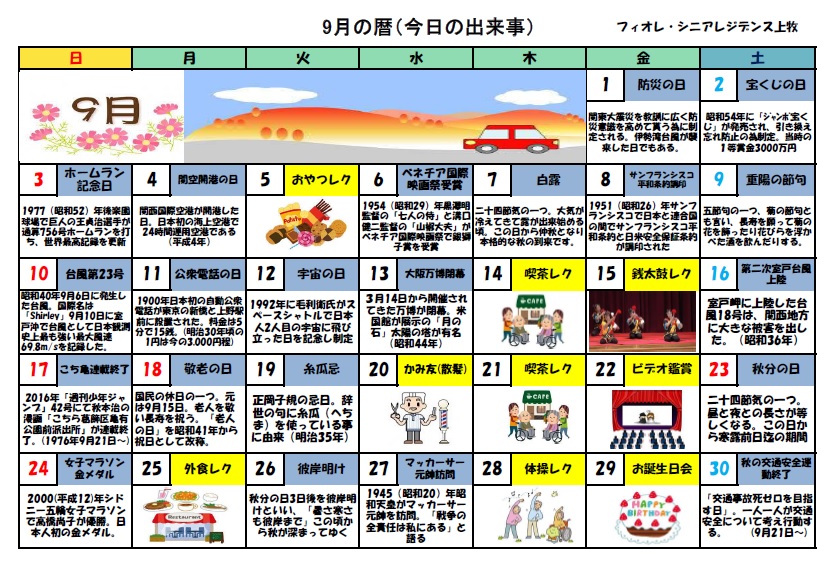 今月の暦カレンダーです。気になる日はありましたか(^^♪ 9月15日は敬老会です。銭太鼓のボランティアに来ていただきます。お楽しみに(^_-)-☆