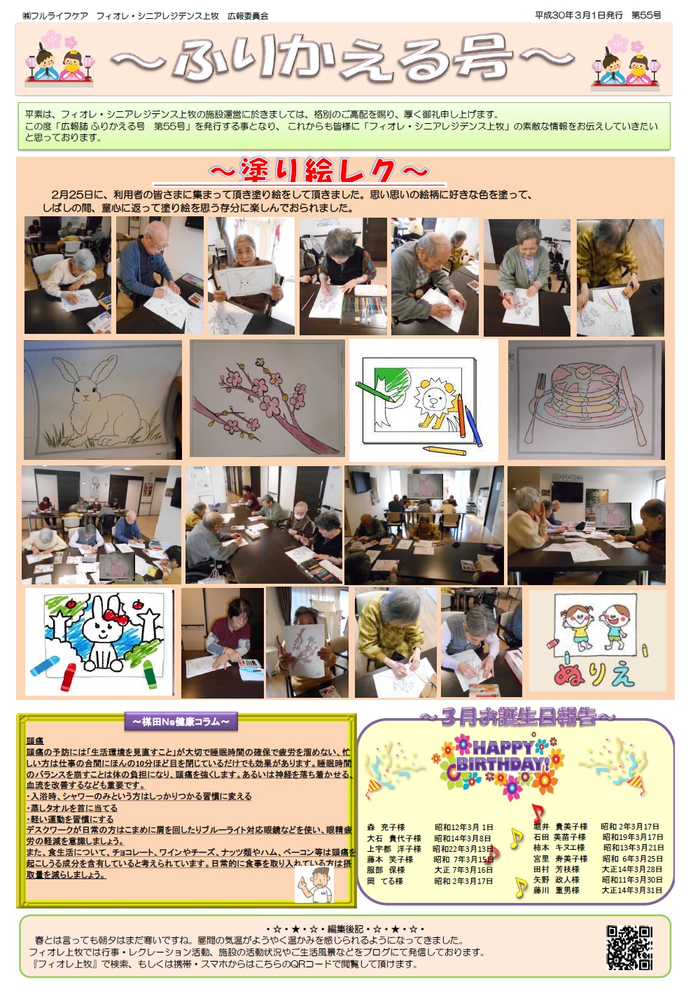 今月の広報誌です。インフルエンザの影響でレクリエーションをストップしていたのであまりネタはないのですが・・・
