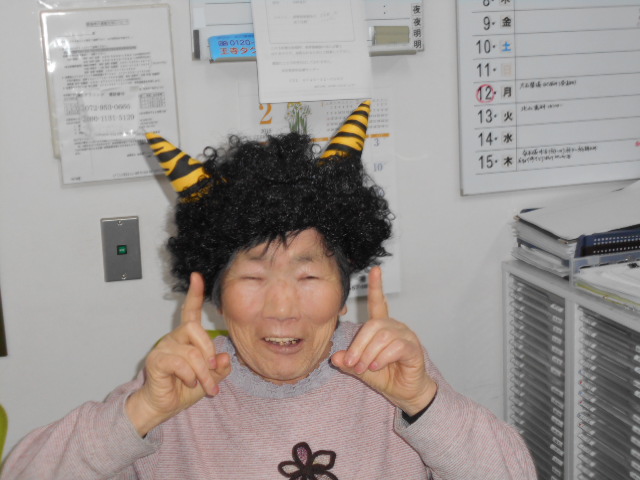 入居者様に鬼の恰好をしてもらいました。本番まであと少し!!