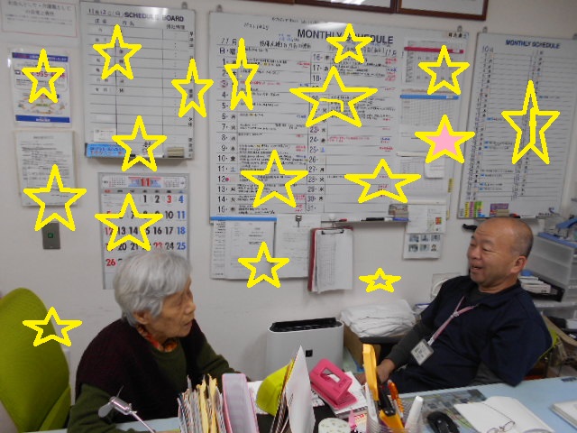 頑張る職員さんシリーズです。入居者様からN相談員に相談されています。笑顔を交えて話しております。相談事があれば遠慮なくN相談員まで!!