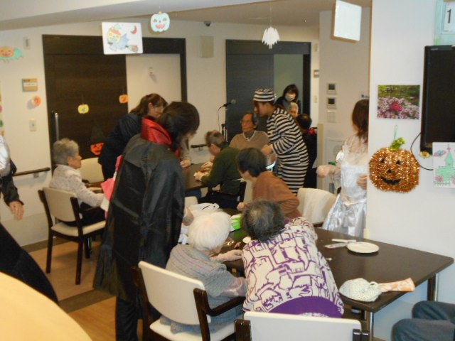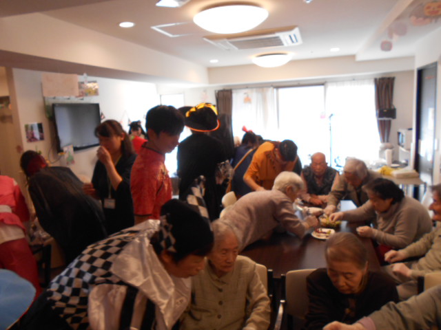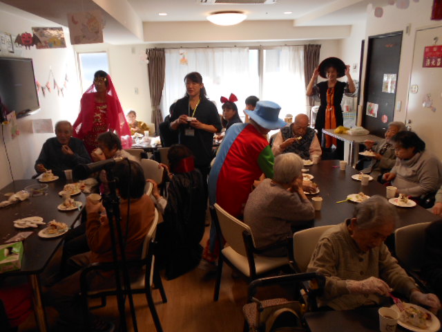 先日のハロウィンパーティーの様子です。フロアに入居者様、職員、新卒者等合わせて40名以上が参加しております。フロアが狭いのでごった返していますがそれはそれで楽しかったです!(^^)!