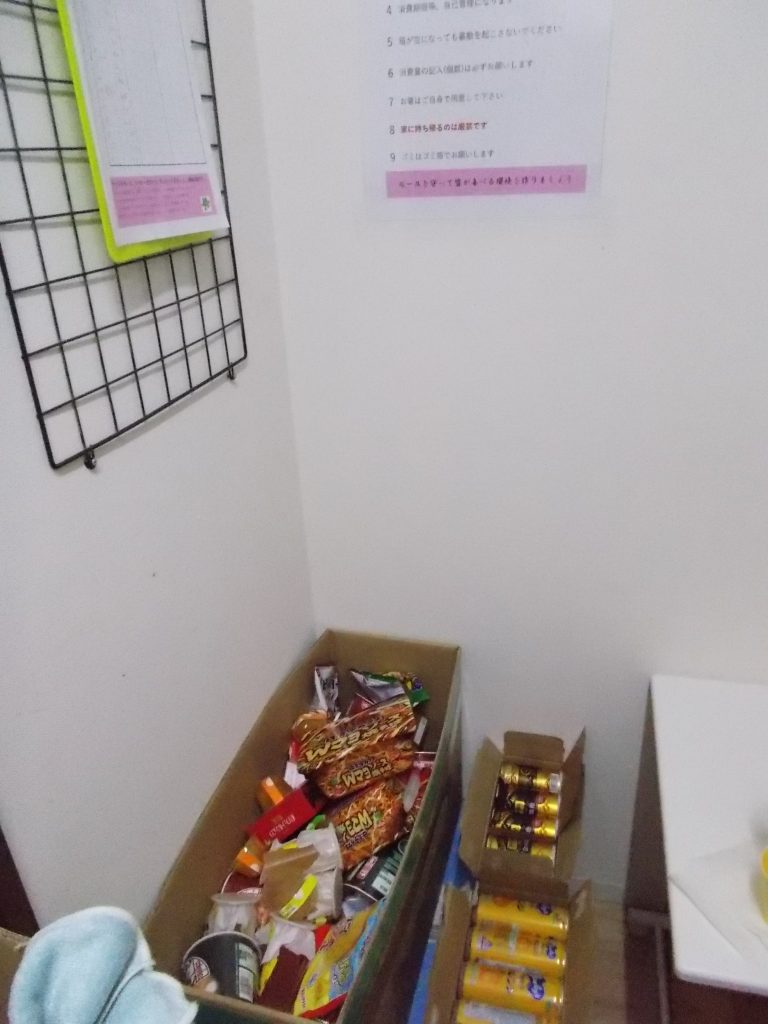 スタッフの給湯室に何やらジュースやお菓子、インスタント食品などなど