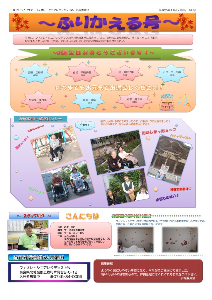 フィオレ・シニアレジデンス川西ではふりかえる号という広報誌を発行しています。