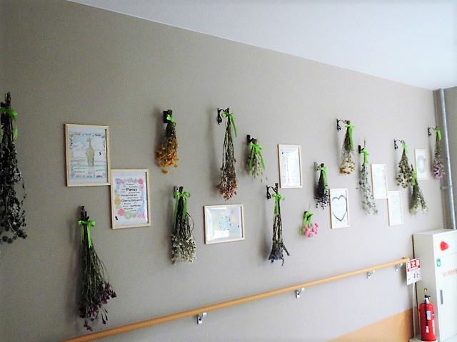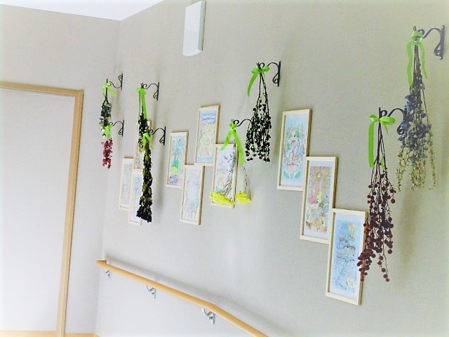 塗り絵が得意なご入居者様の作品とドライフラワーの