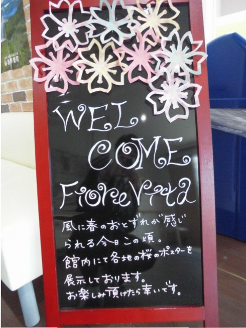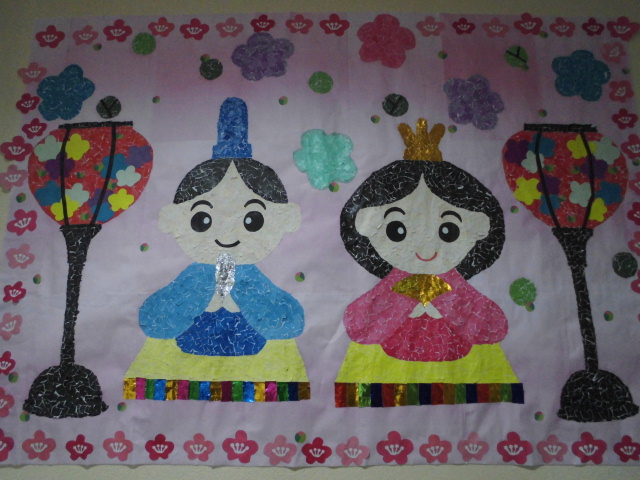 玄関前には季節に応じた「ポスター」や「ちぎり絵」を飾らせていただいています。