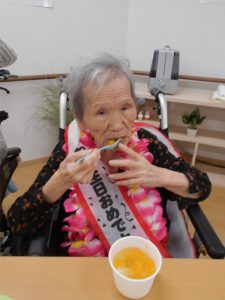 ワーカーさんが、細かくして安全に白玉入りフルーツポンチを食べて頂きました。