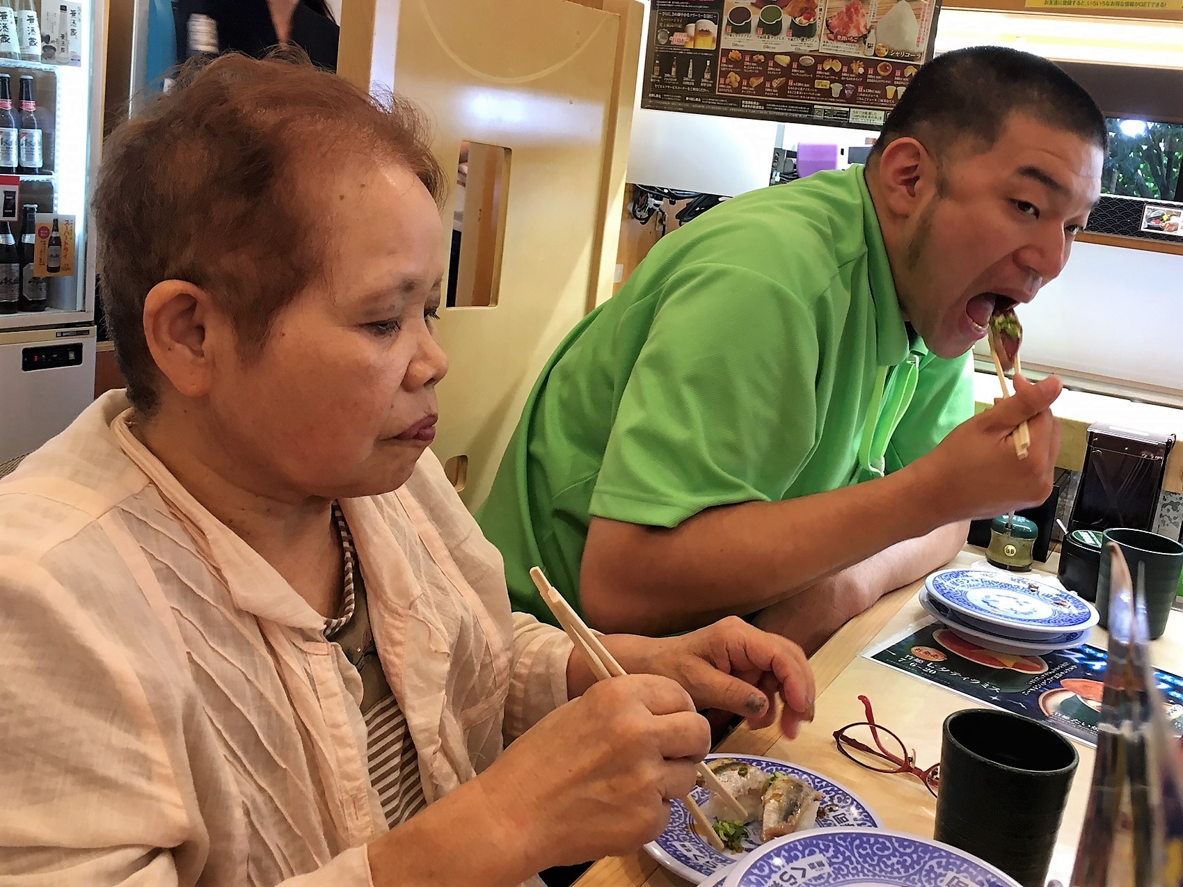 積み上げたお皿の数と顔から満足感が溢れ出てますね 😆