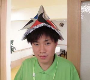 早速、新入職員のSさんに被ってもらいました。