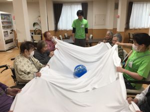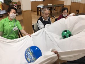 ストレッチのあとは、シーツを使ってボールを転がす運動です。