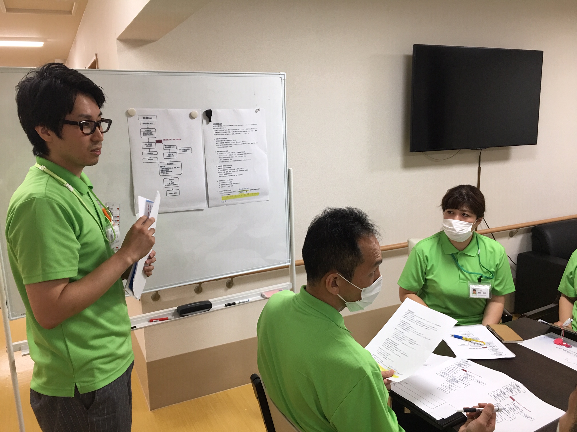 研修は緊急時の対応と事故報告書の書き方についてです。