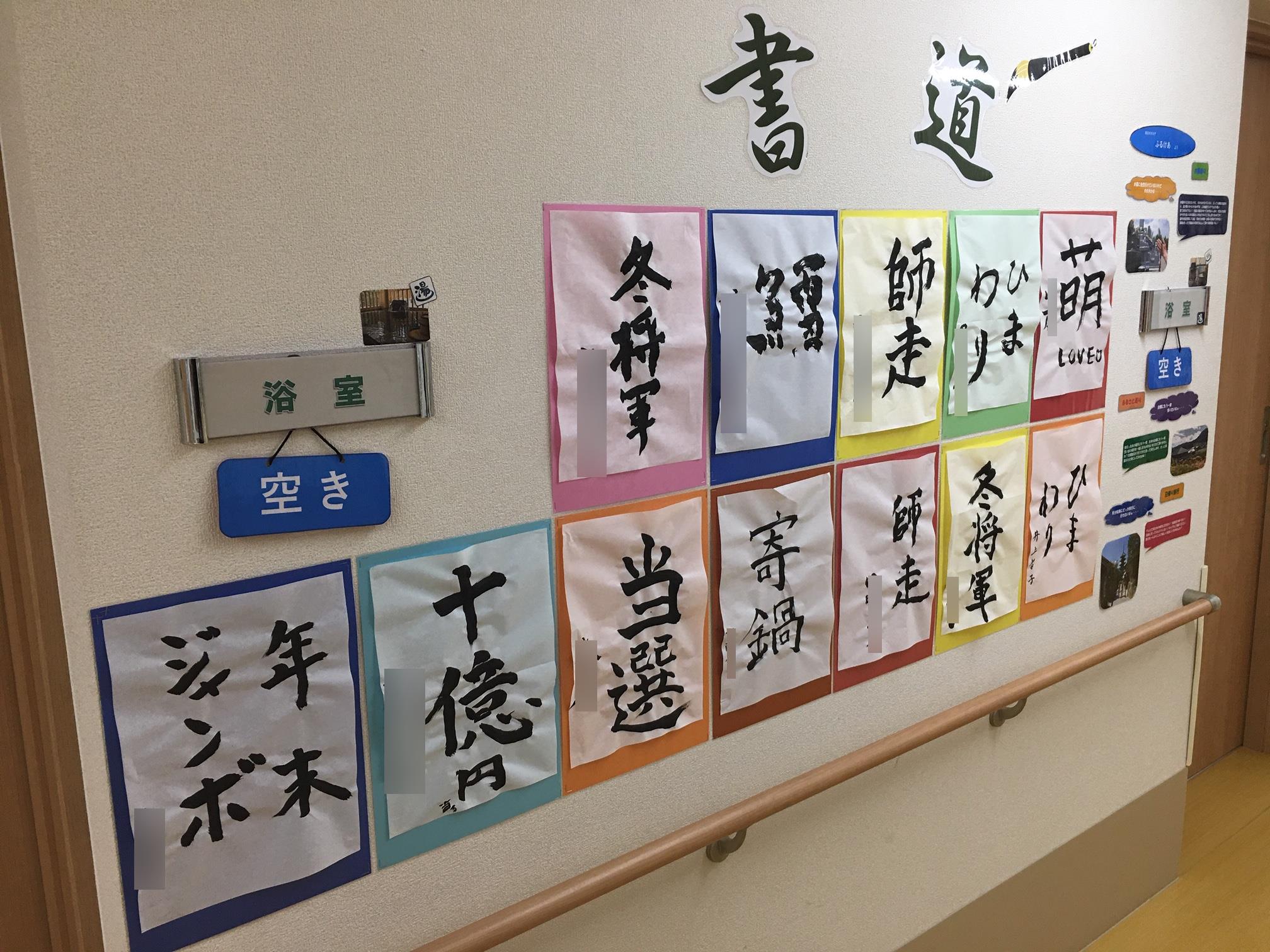 入居者様の作品とともに書道コーナーに展示しています