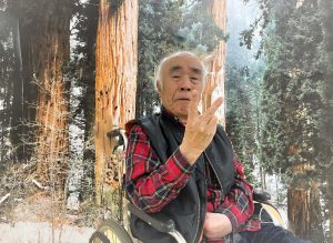 広報委員長、Oケアワーカーの作った大きな雪景色の壁紙のまえで