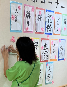 今月の書道レクは「桜」「春」「弥生」「入学」を書きました‼