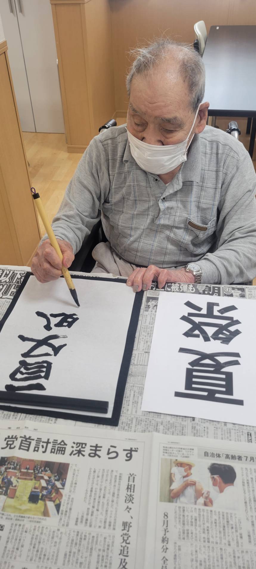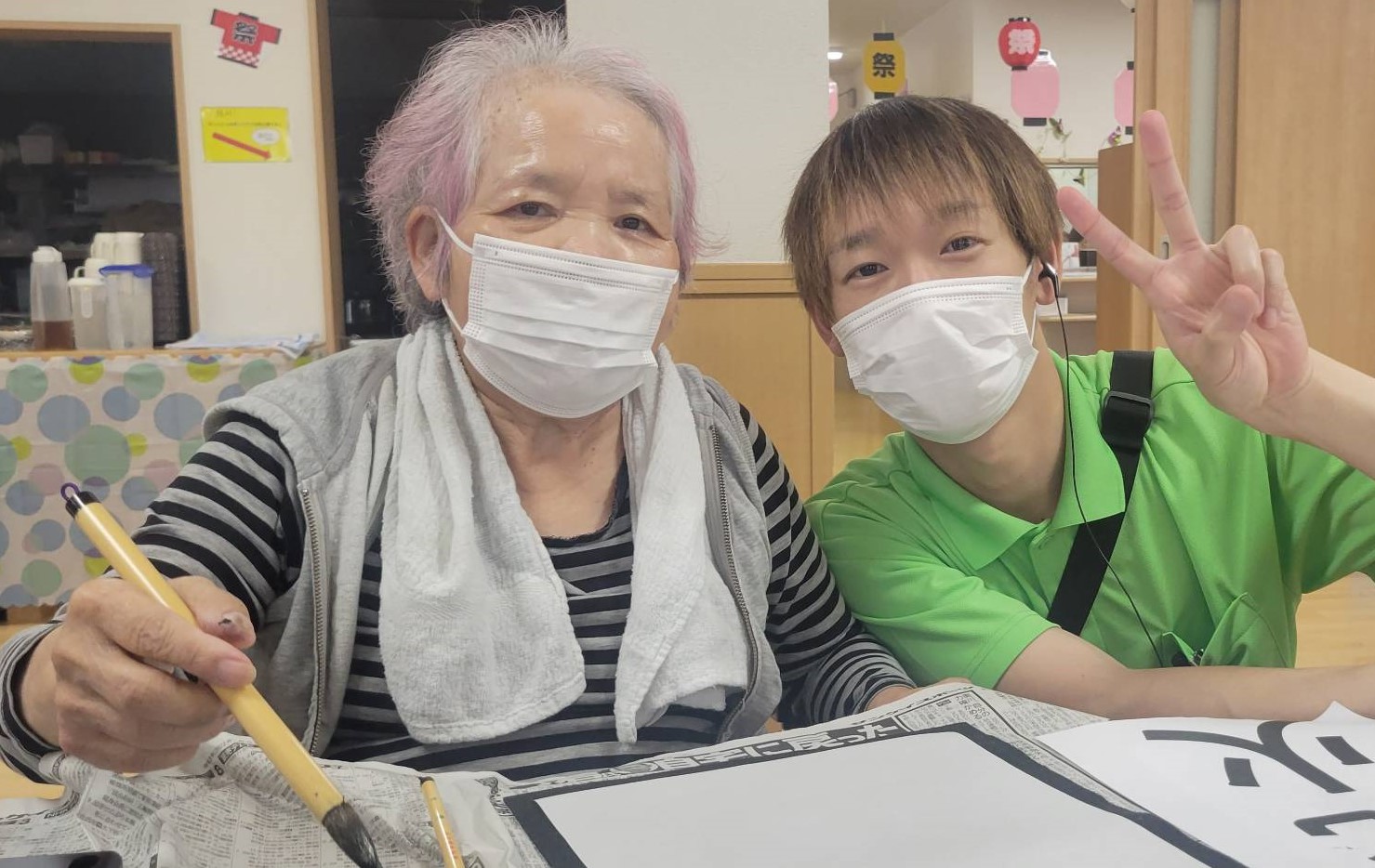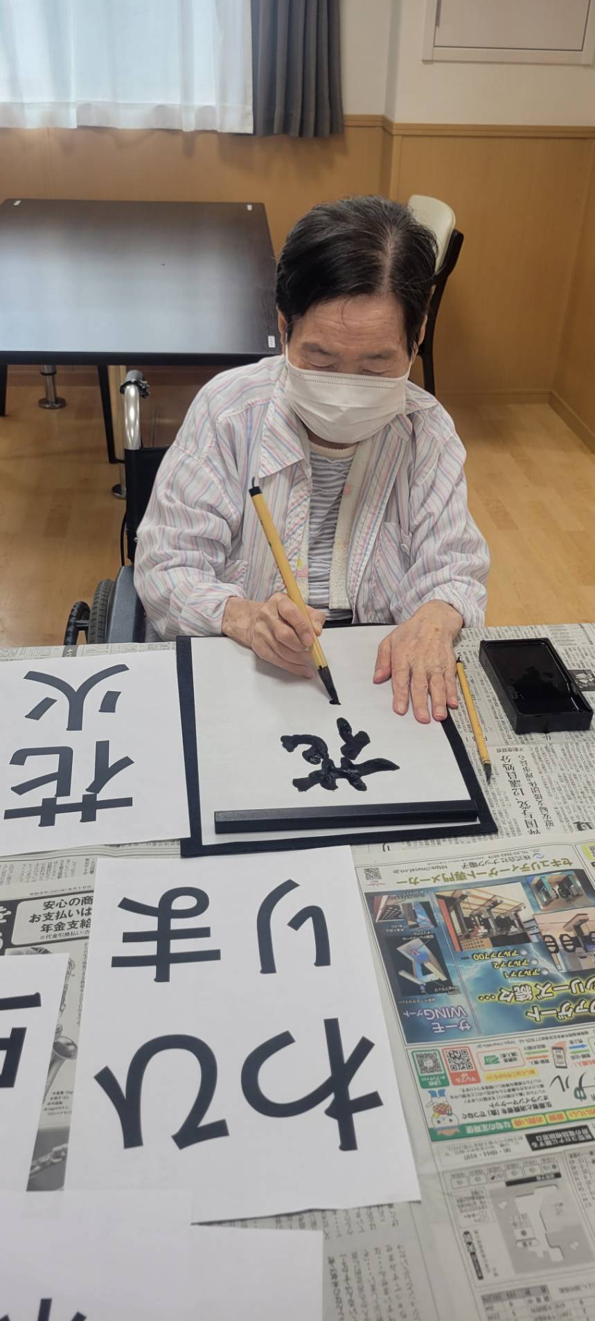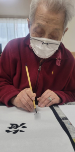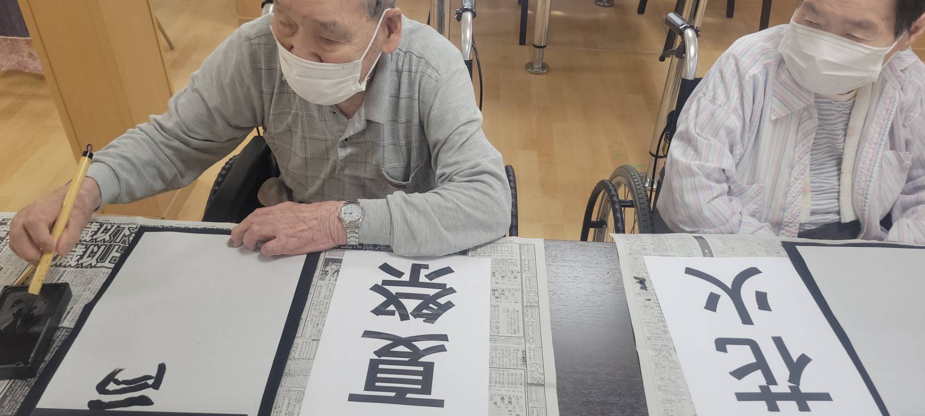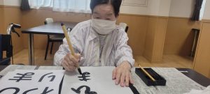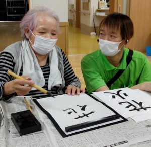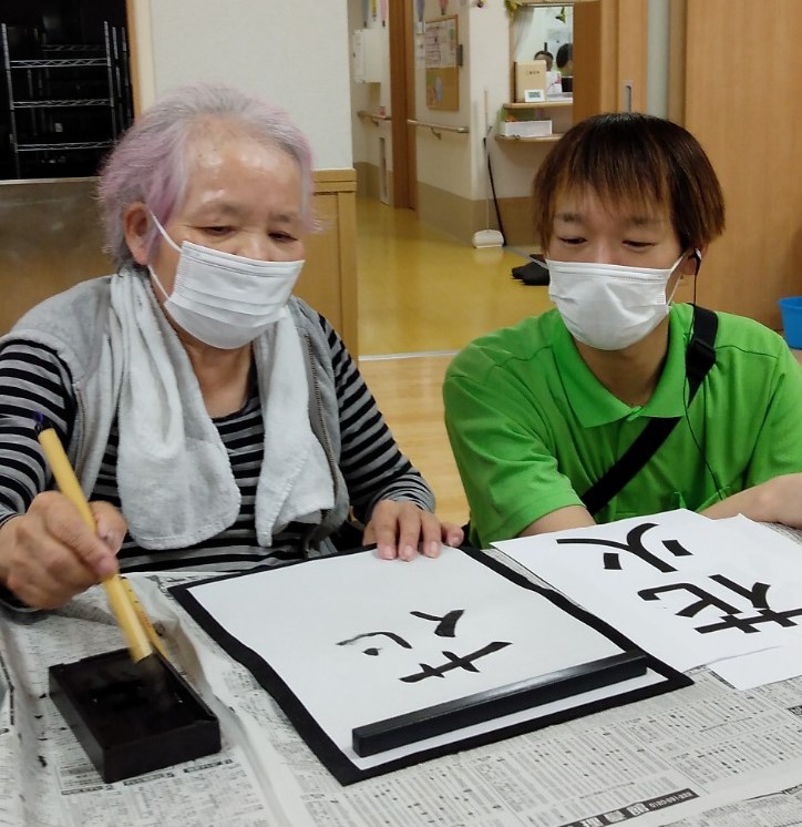Sケアワーカーと仲良く書道されているのは、、、