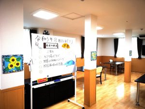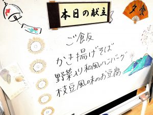 食堂のホワイトボードも手書きでヒマワリと涼しげな絵を書いてくれています。