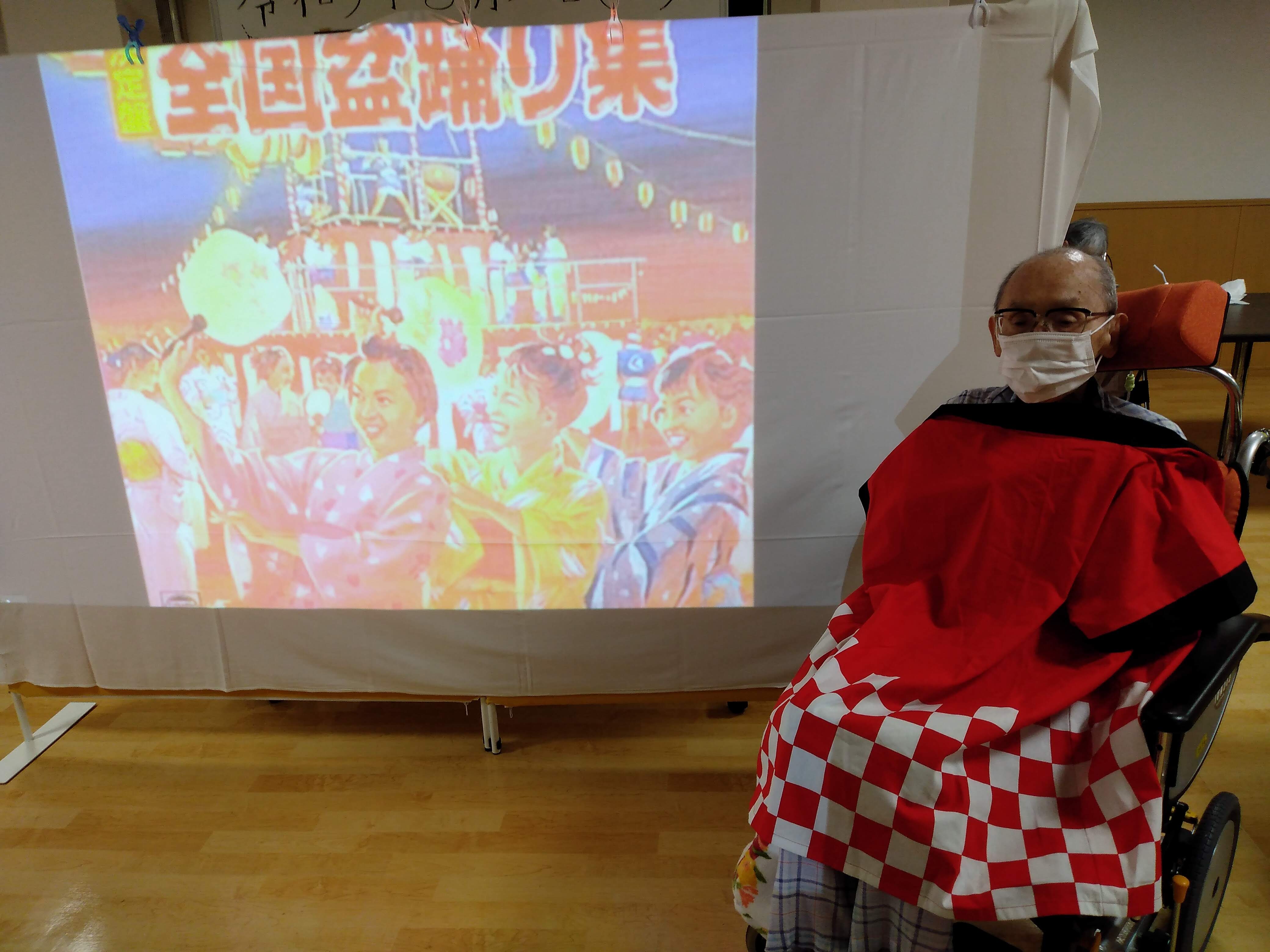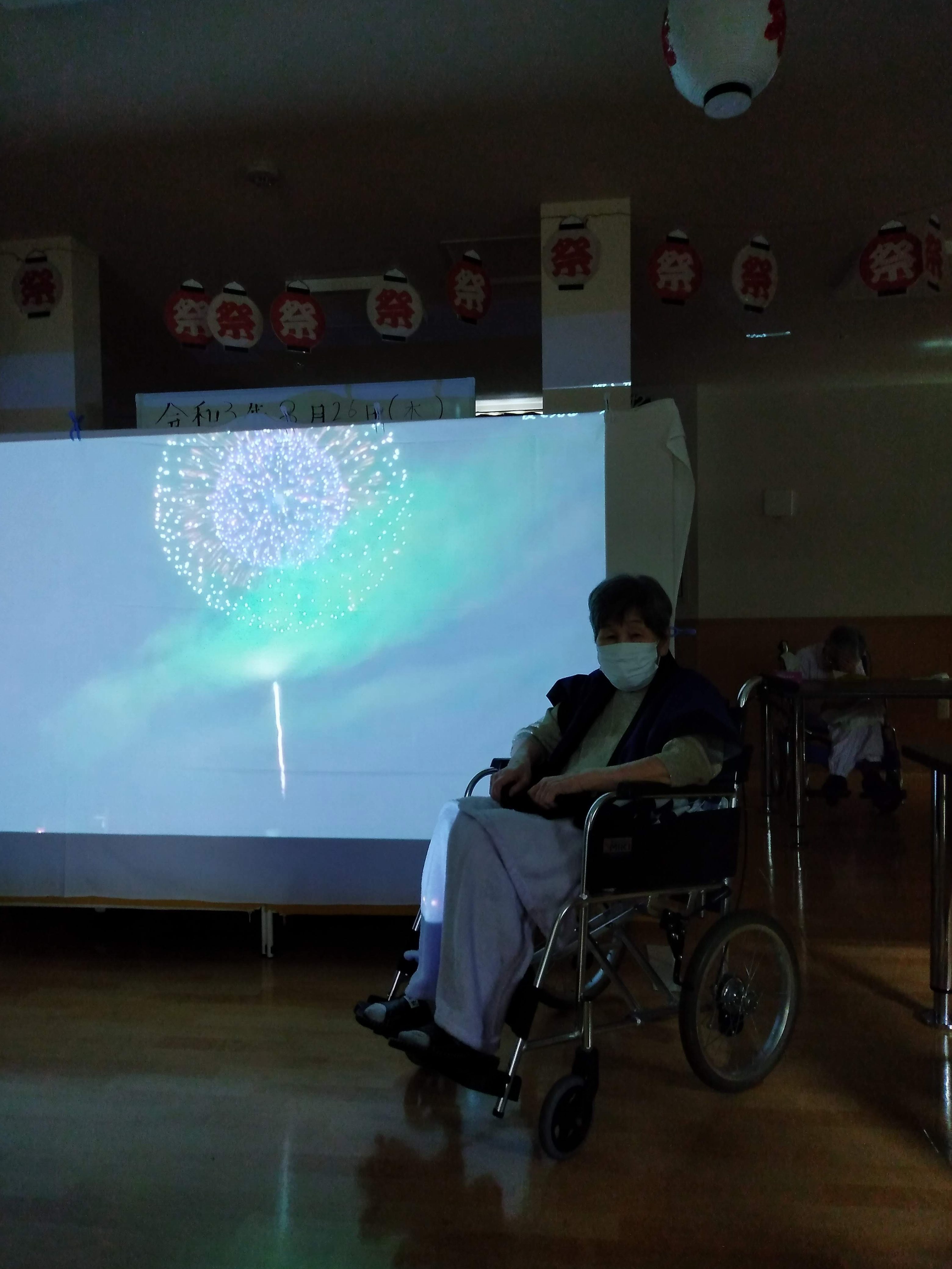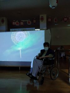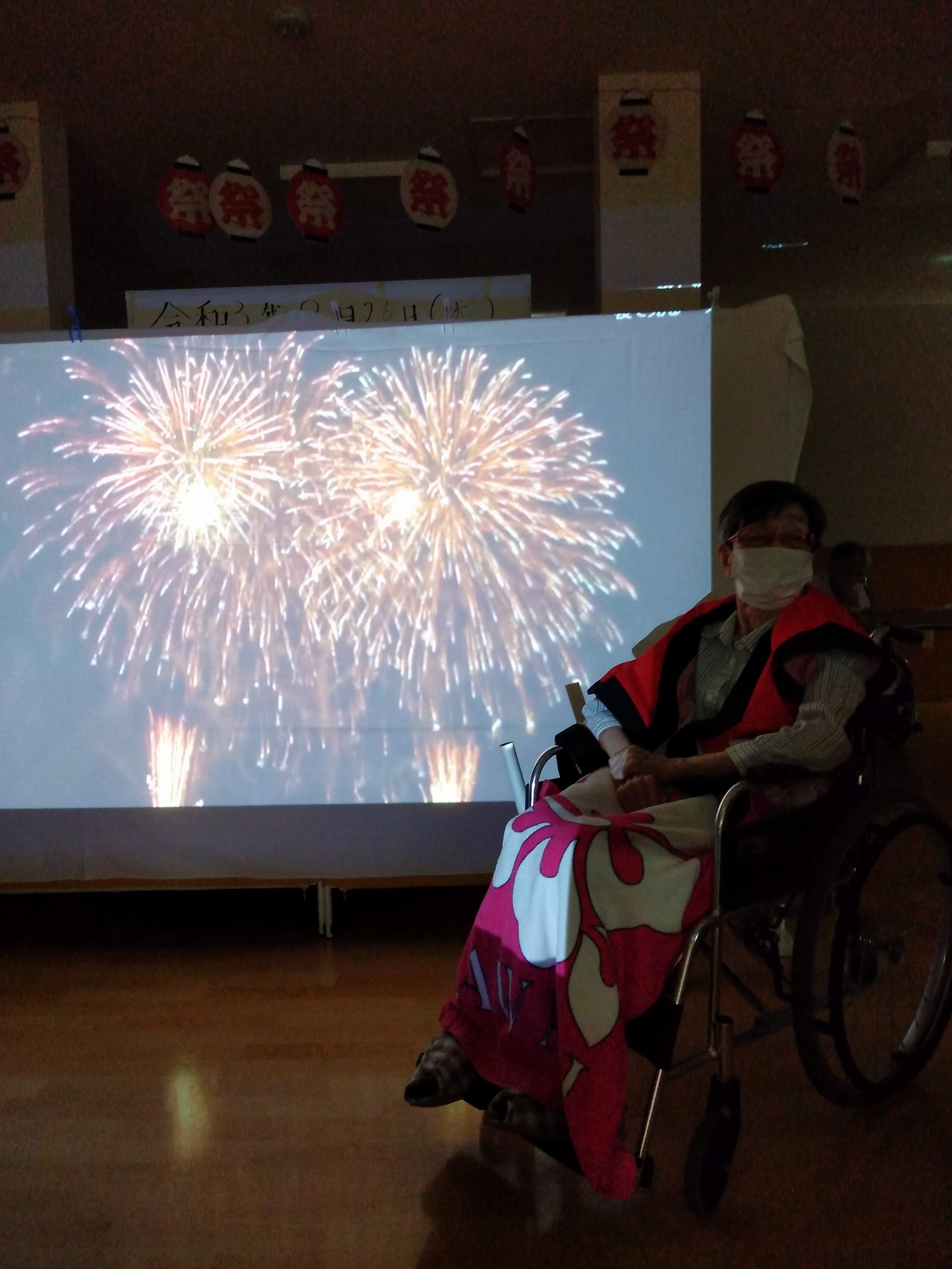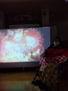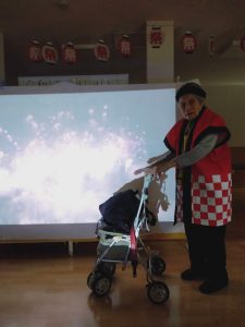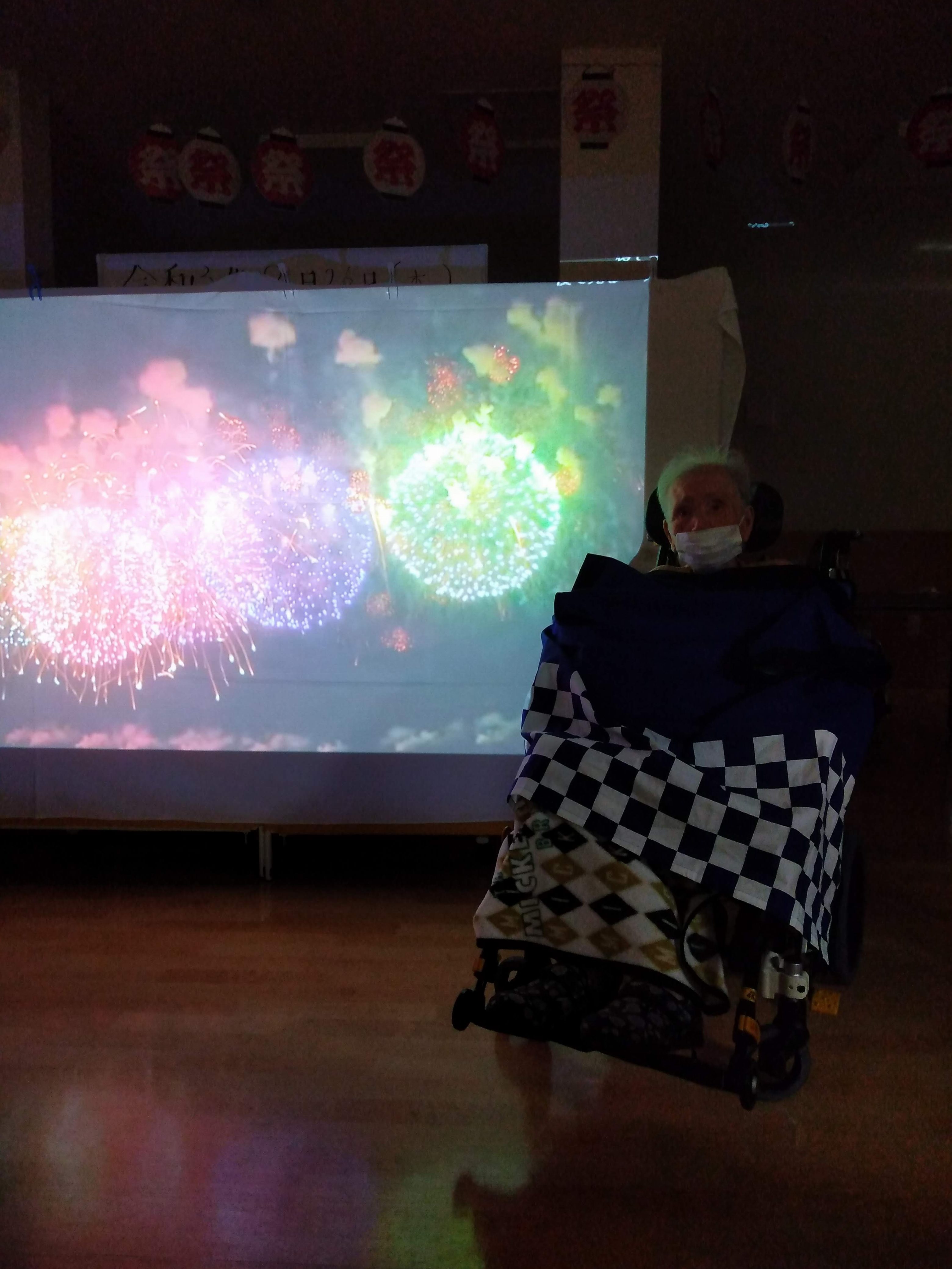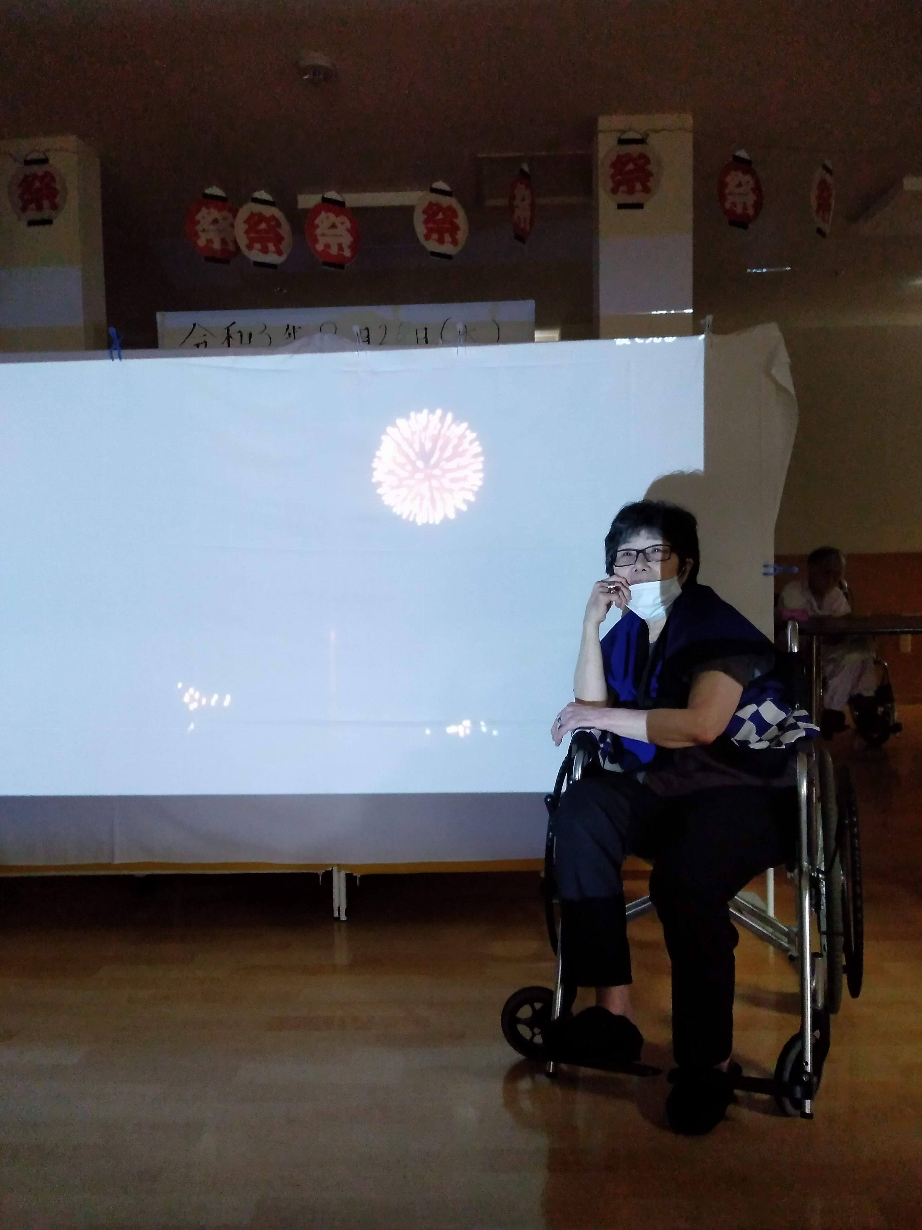 プロジェクター前での花火や盆踊りの映像の前で写真を撮りました📸