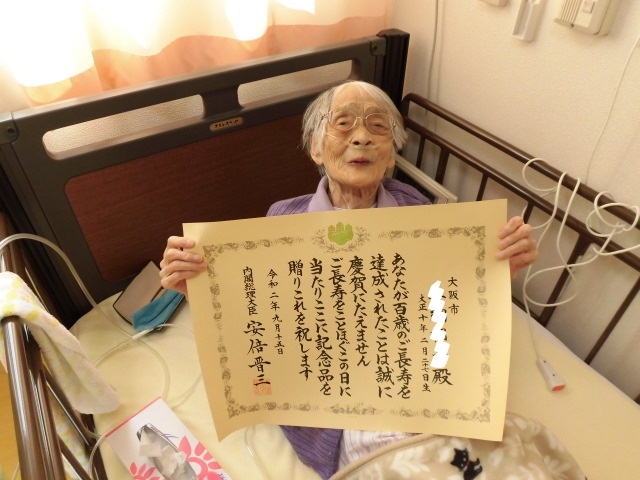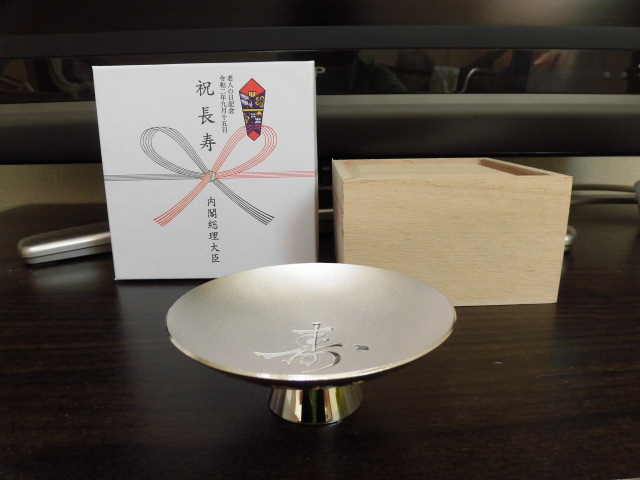 100歳の紀寿を迎えられたK様宛に、内閣総理大臣から(!)、表彰状と銀杯が届きました(*´▽`*)