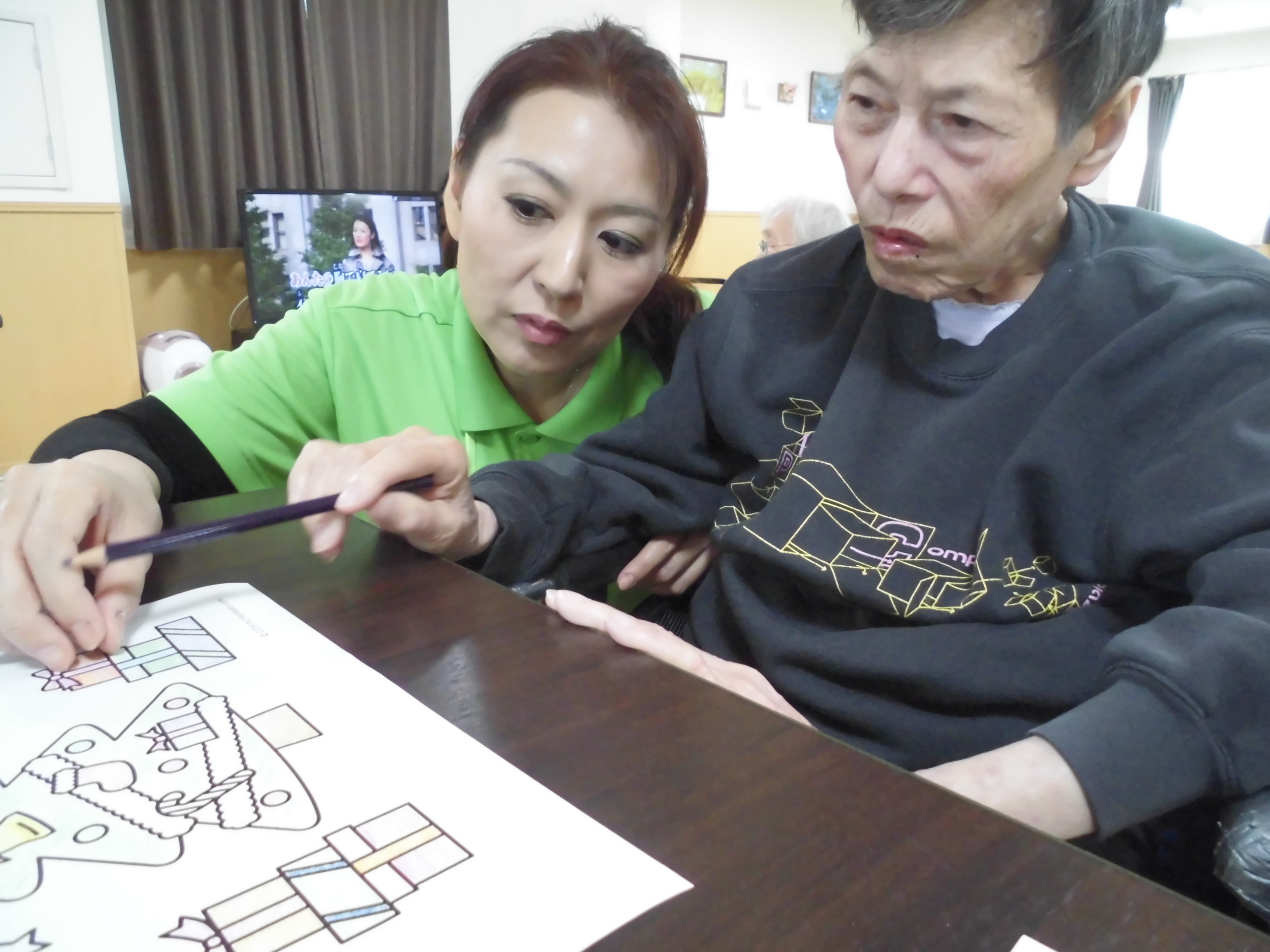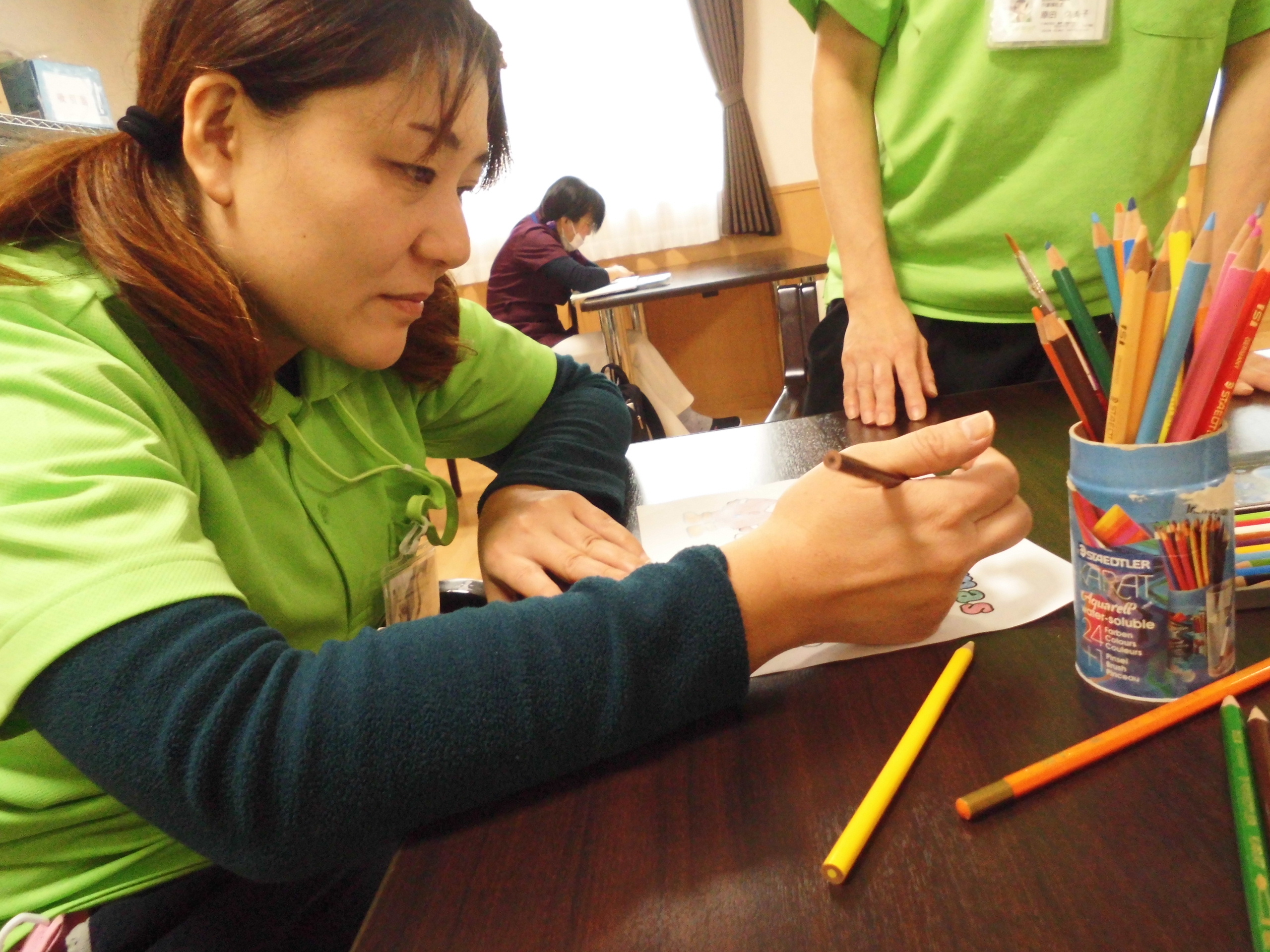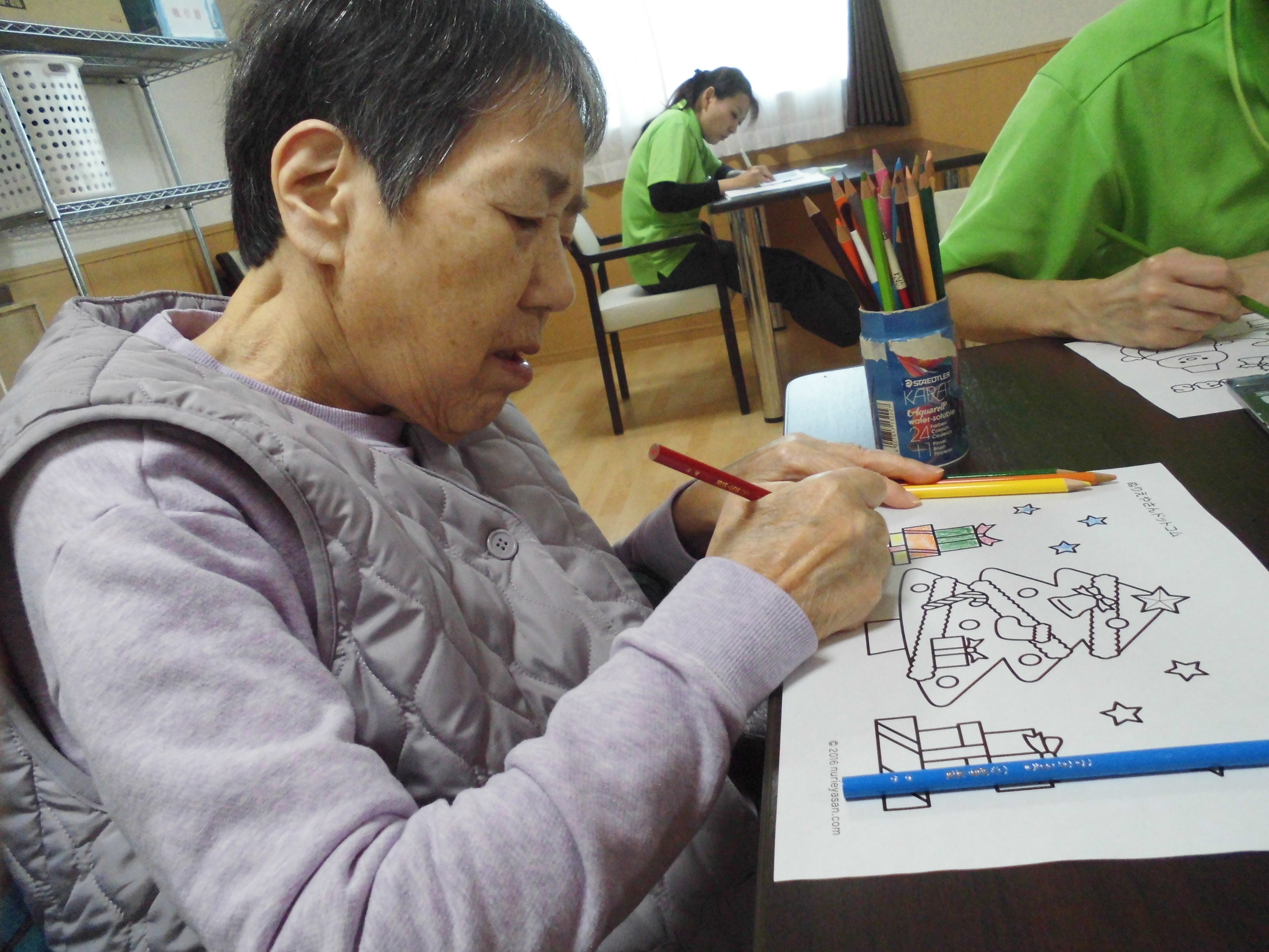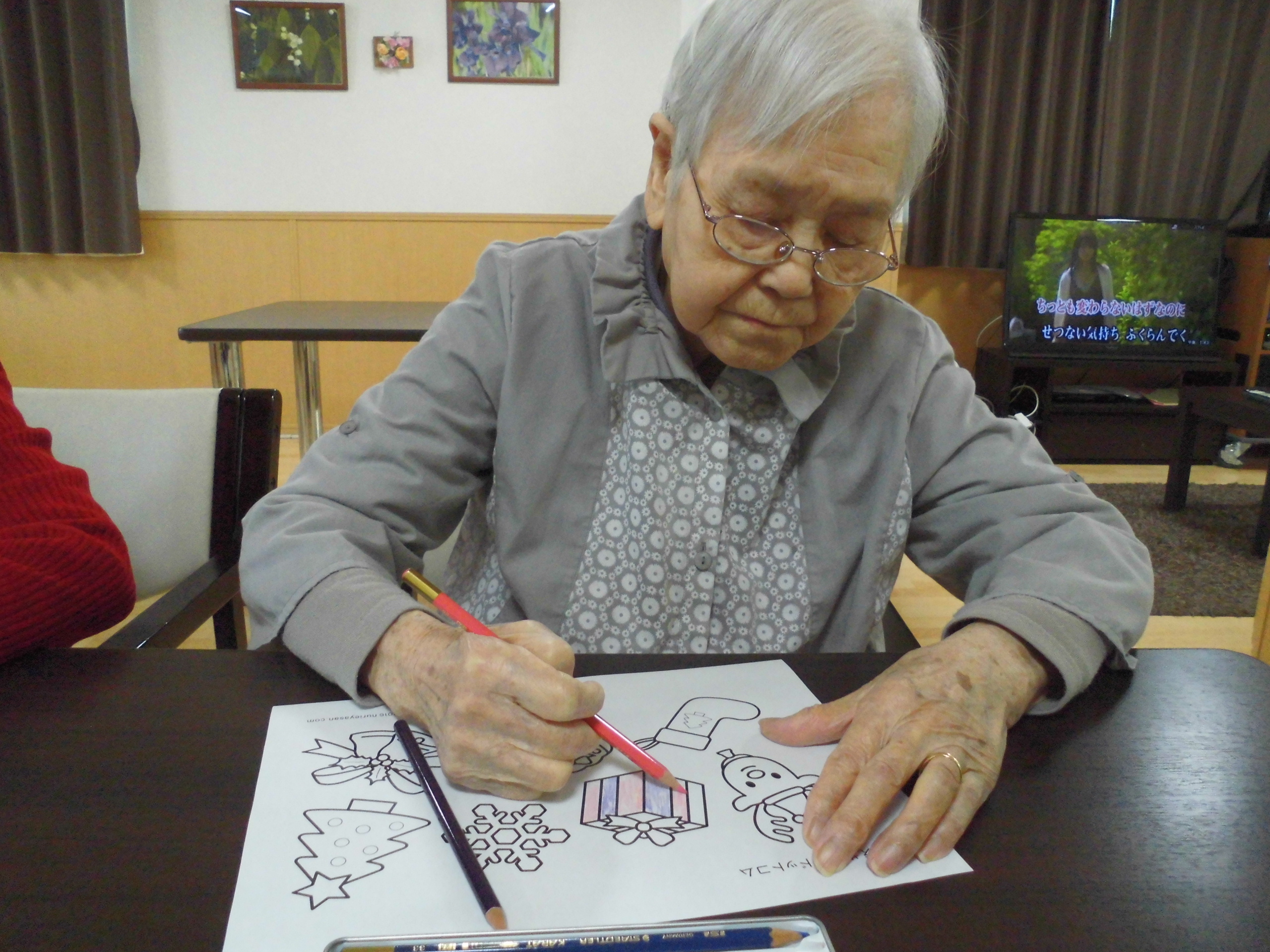 クリスマスのぬり絵ですね~🎄 皆様真剣に取り組んでおられます。